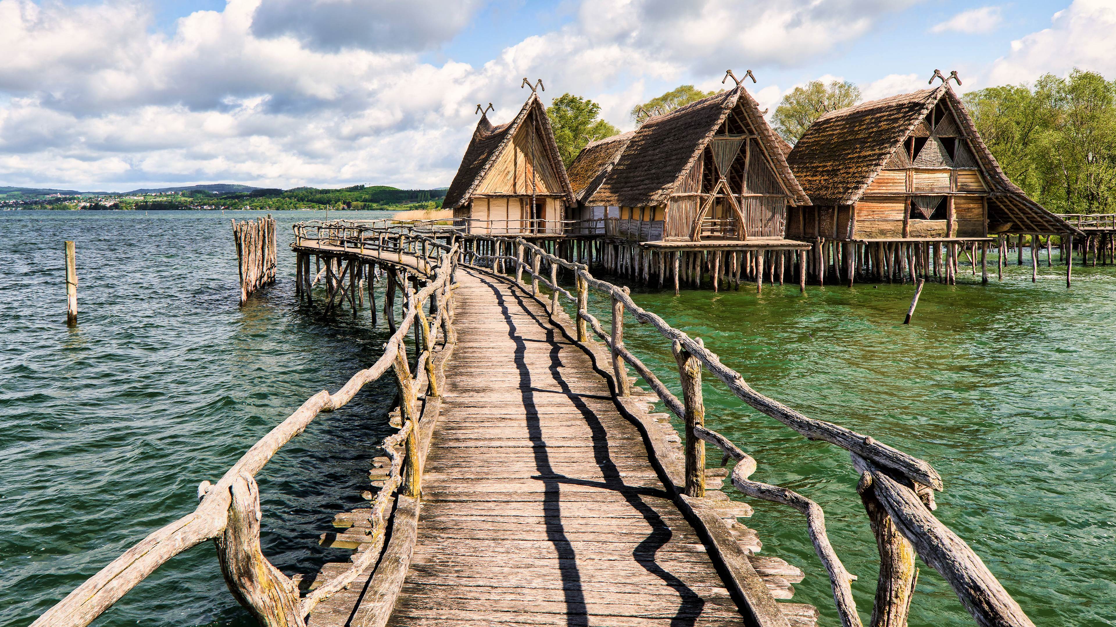 Fußgängerbrücke über den See zu den Stelzenhäusern, Unteruhldingen, Baden-Württemberg © Harald Nachtmann/Getty Images Sport, Natur und Kultur Fußgängerbrücke über den See zu den Stelzenhäusern, Unteruhldingen, Baden-Württemberg