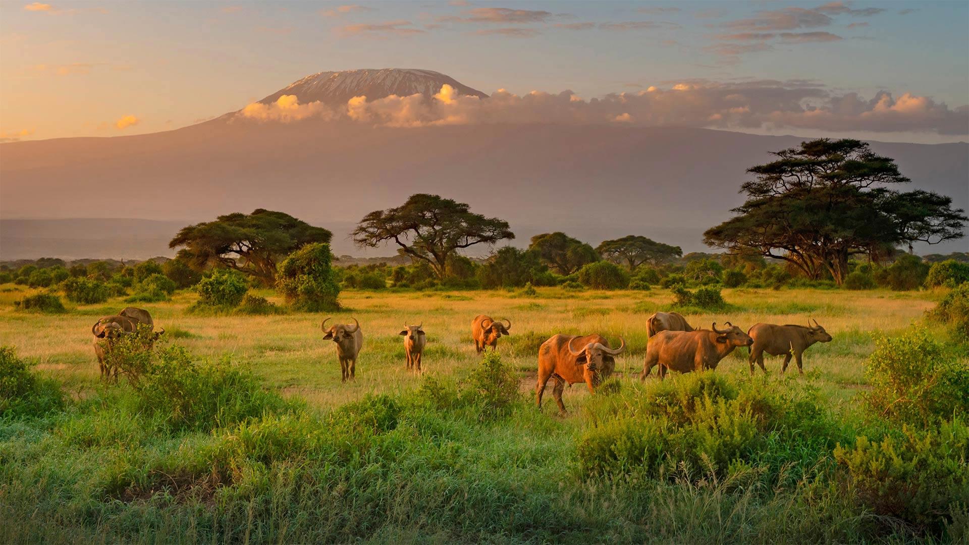 Kilimandscharo mit Kaffernbüffeln im Vordergrund, Amboseli-Biosphärenreservat, Kenia © RealityImages/Shutterstock Ein Experiment in Sachen Nachhaltigkeit Kilimandscharo mit Kaffernbüffeln im Vordergrund, Amboseli-Biosphärenreservat, Kenia
