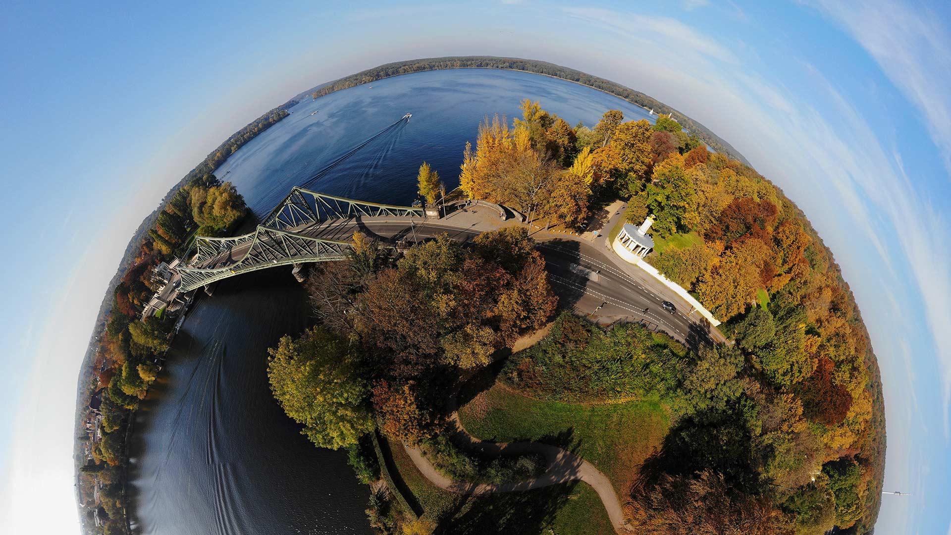 Kugelpanorama-Luftbild Little Planet der Glienicker Brücke, Potsdam, Brandenburg © 360b/Alamy Symbol der Teilung und der Einheit Kugelpanorama-Luftbild Little Planet der Glienicker Brücke, Potsdam, Brandenburg