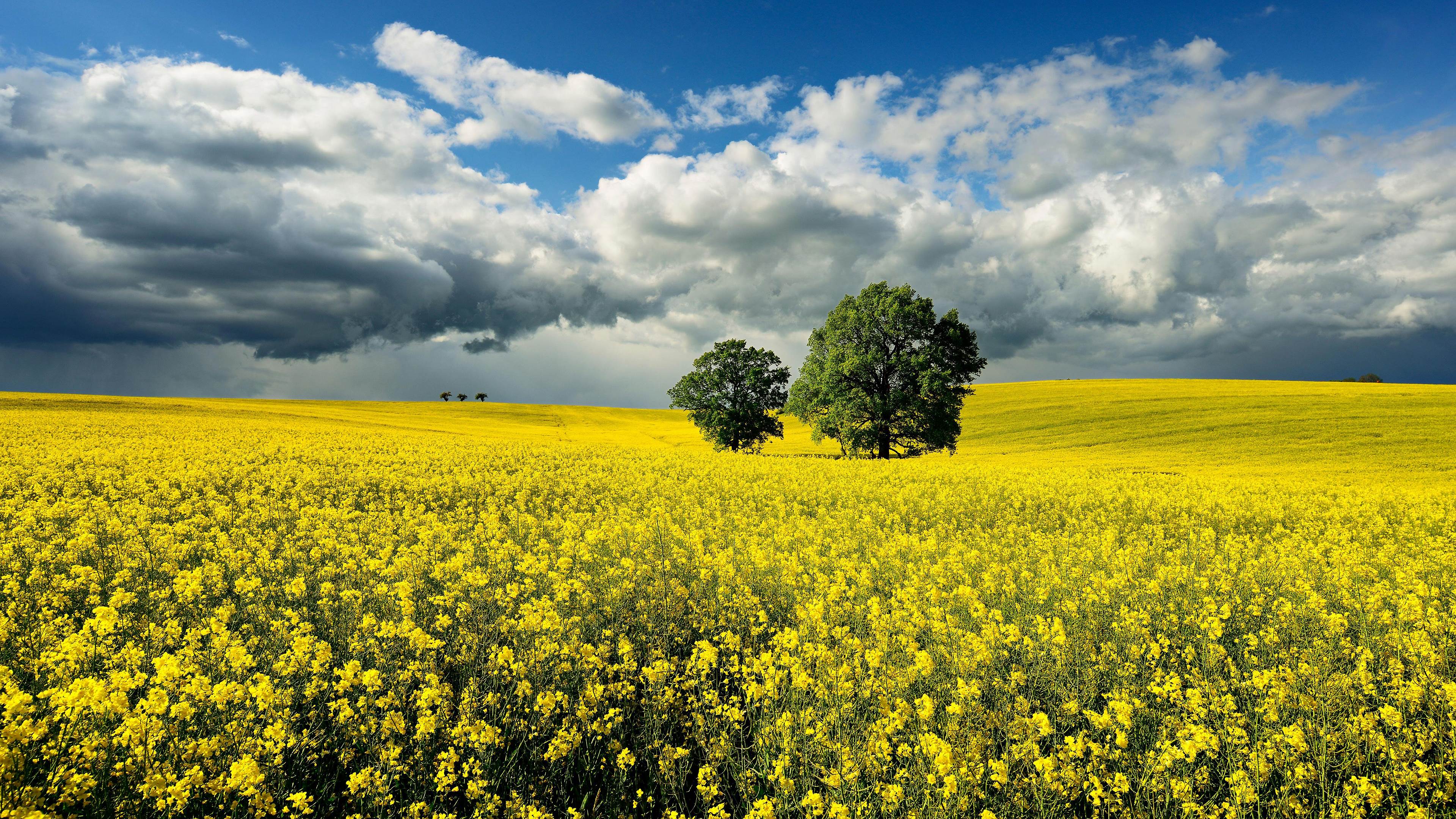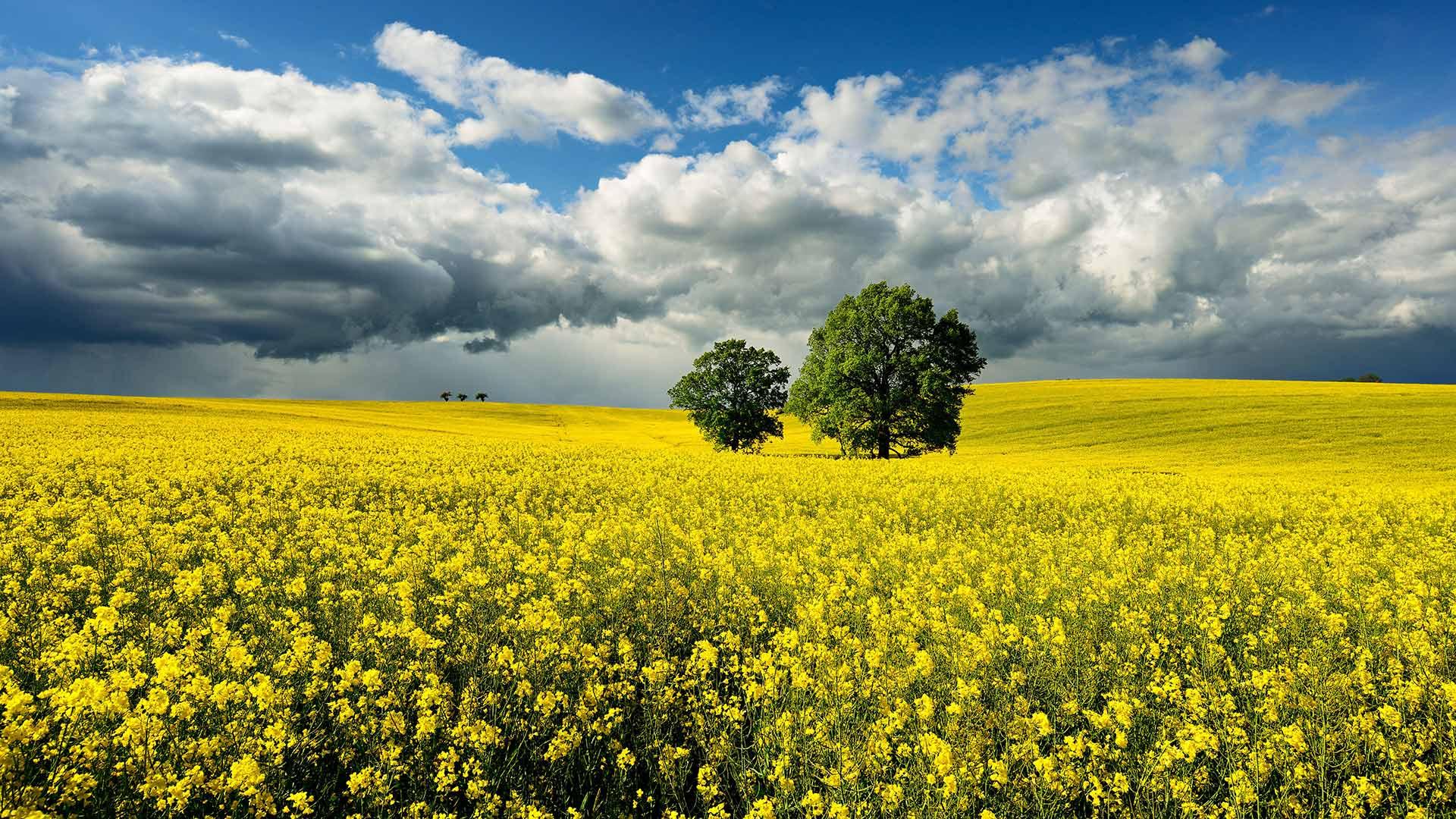 Eichen in einem Rapsfeld bei aufziehendem Gewitter, Sachsen-Anhalt © mauritius images GmbH/Alamy Stock Photo Bald ist Erntezeit Eichen in einem Rapsfeld bei aufziehendem Gewitter, Sachsen-Anhalt