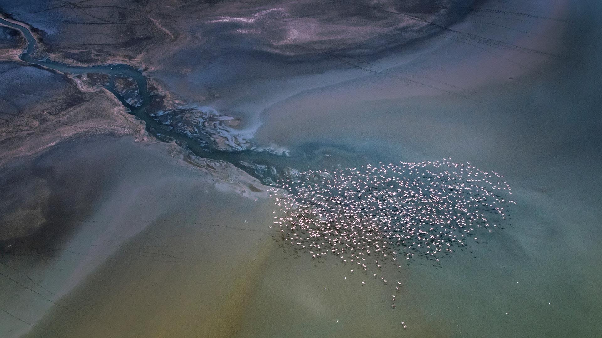 Lesser flamingos flying over Lake Magadi, Kenya © Vicki Jauron, Babylon and Beyond Photography/Getty Images Bird's-eye view Lesser flamingos flying over Lake Magadi, Kenya