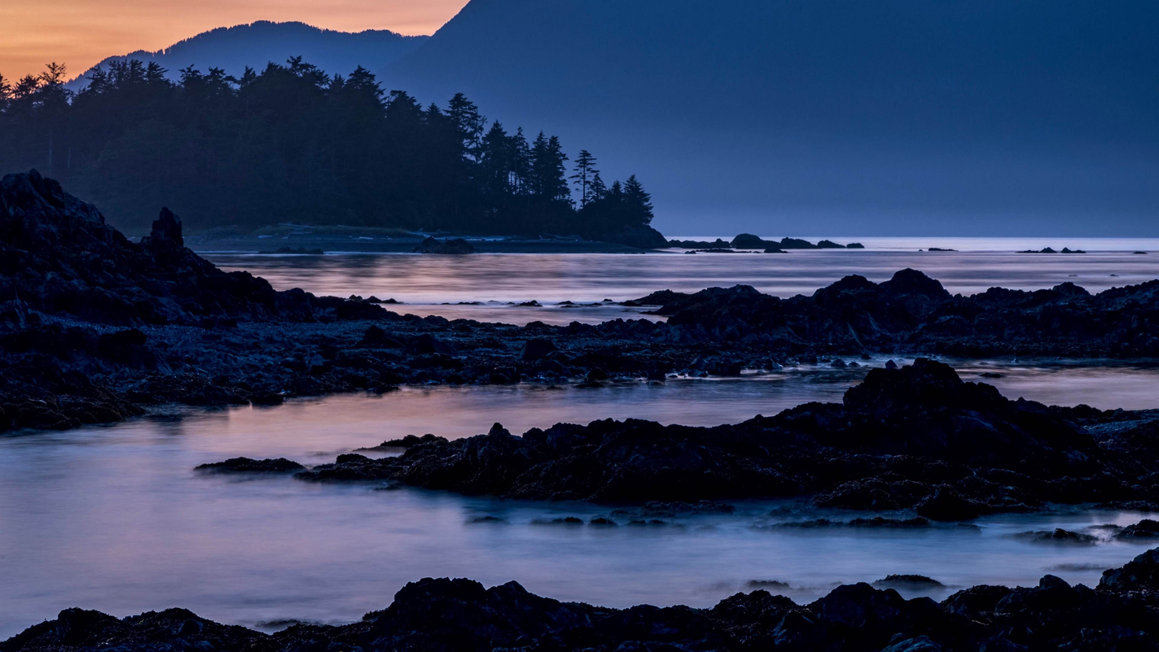 Dusk falls over Vancouver Island viewed from an islet in Nuchatlitz Provincial Park, British Columbia