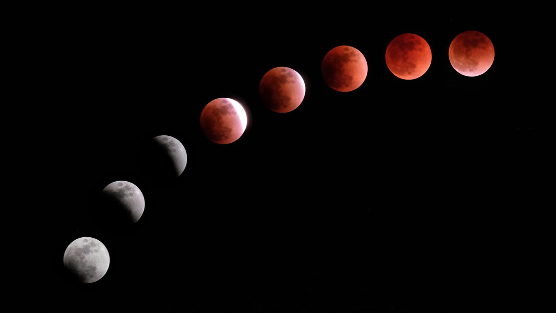 今晚,在地球的许多地方都可以看到月全食,当月亮、地球、太阳完全在一条直线上的时候,地球在中间,整个月亮全部走进地球的影子里,月亮表面变成暗红色,就形成了月全食。这张合成照片显示的是2018年1月31日发生的月全食的完整过程,神秘而美丽,好奇的你,还等什么?