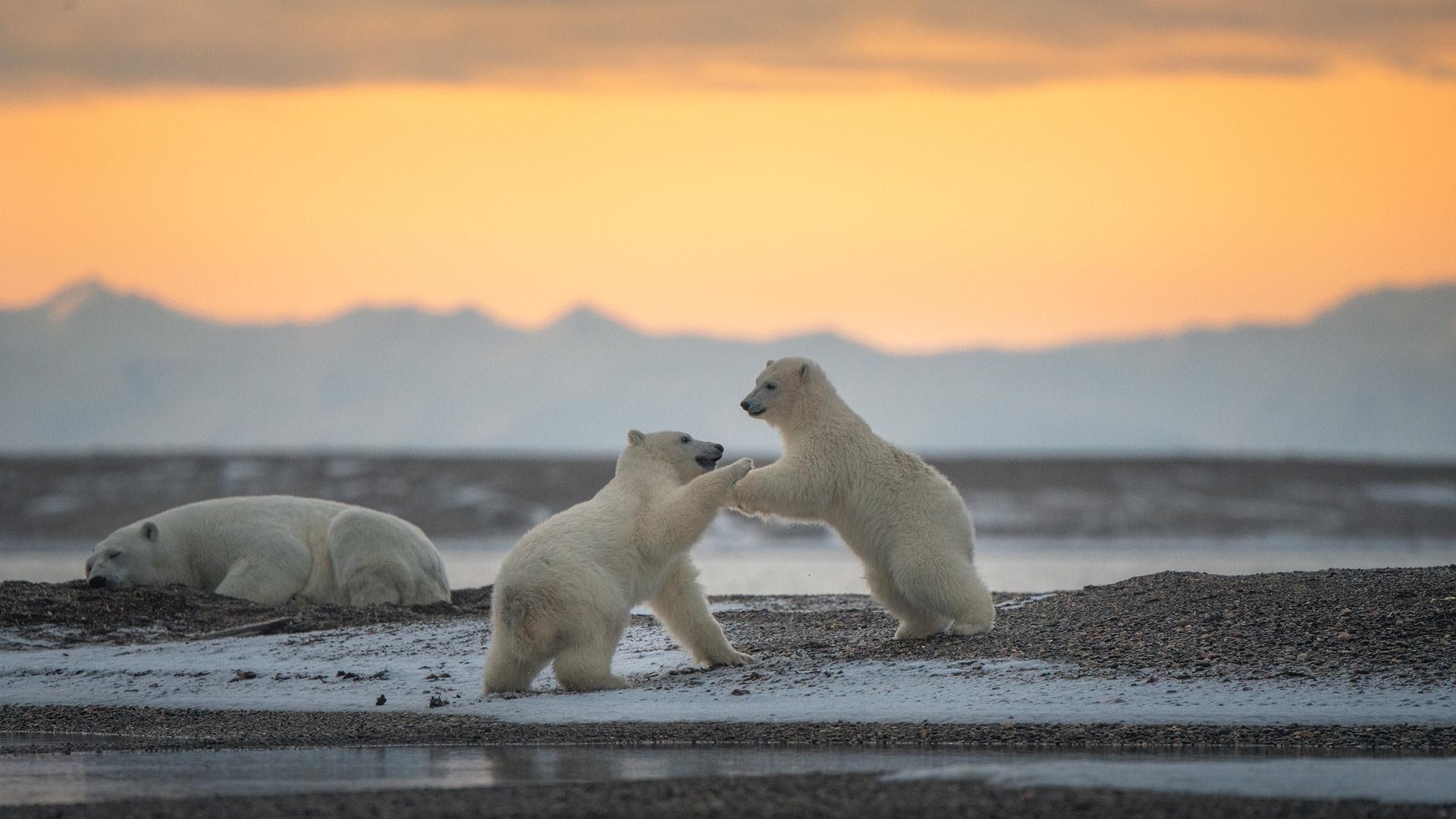 Polar bear cubs playing, Kaktovik, Alaska © Piriya Photography/Getty Images An ice day to play Polar bear cubs playing, Kaktovik, Alaska