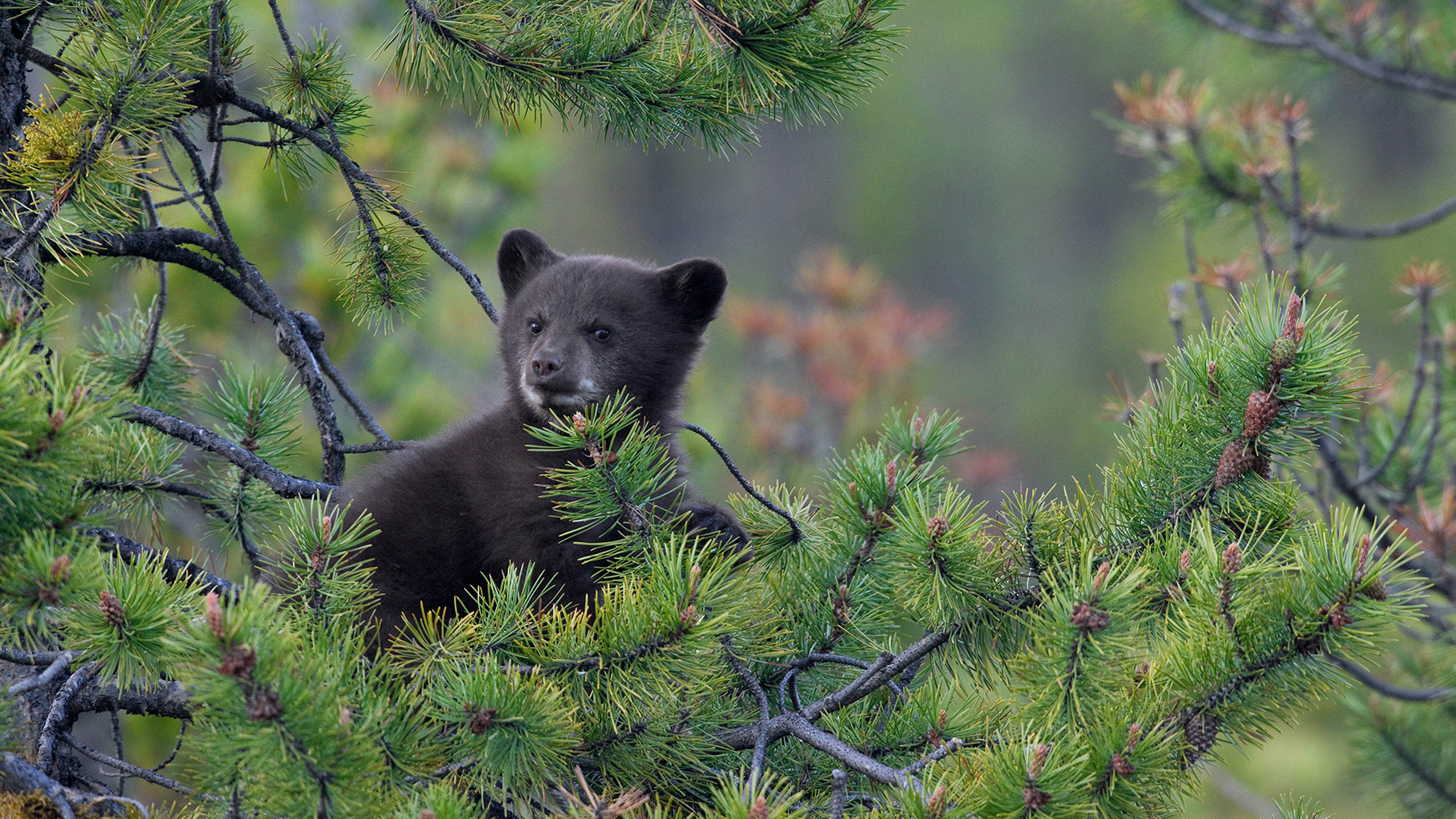 松树上的一只美国黑熊幼崽,加拿大贾斯珀国家公园 (© Donald M. Jones/Minden Pictures)