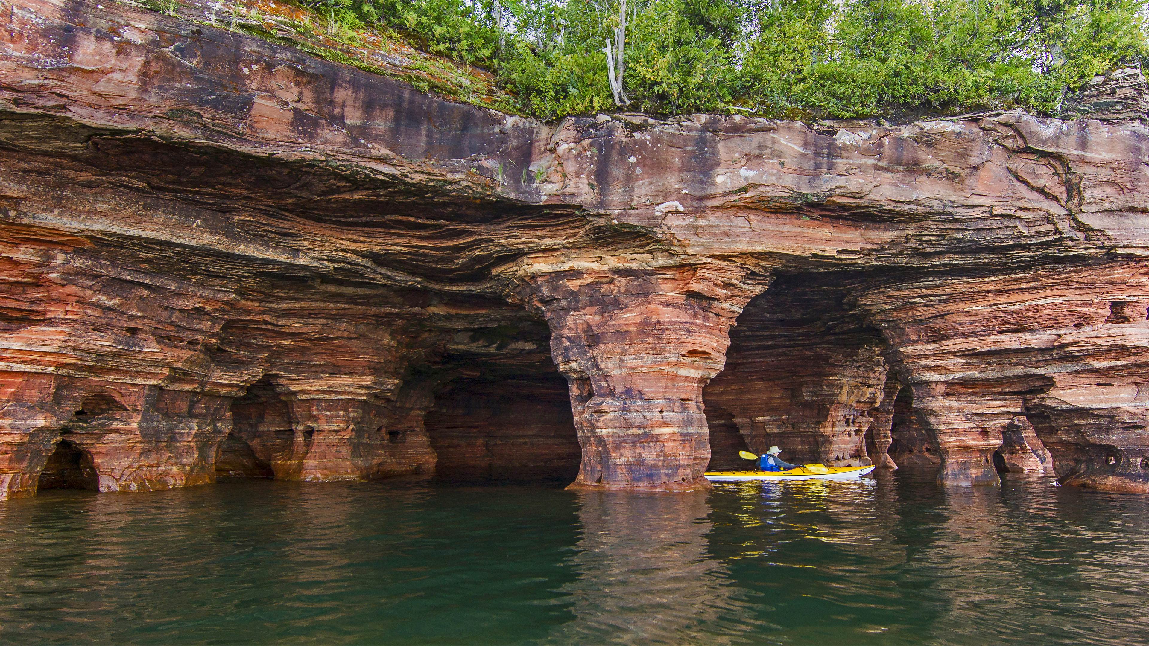威斯康星州贝菲尔德附近的阿波斯特尔群岛国家湖岸,一只皮划艇正在探索砂岩海蚀洞 (© Chuck Haney/Danita Delimont)