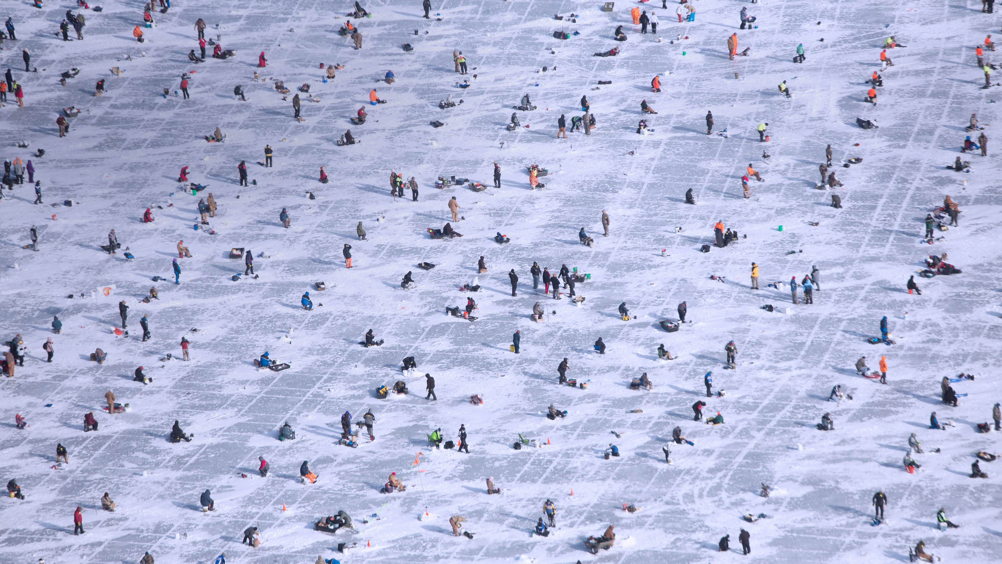 人们在布雷纳德的加尔湖上冰钓,明尼苏达州 (© Robert Benson/Cavan)