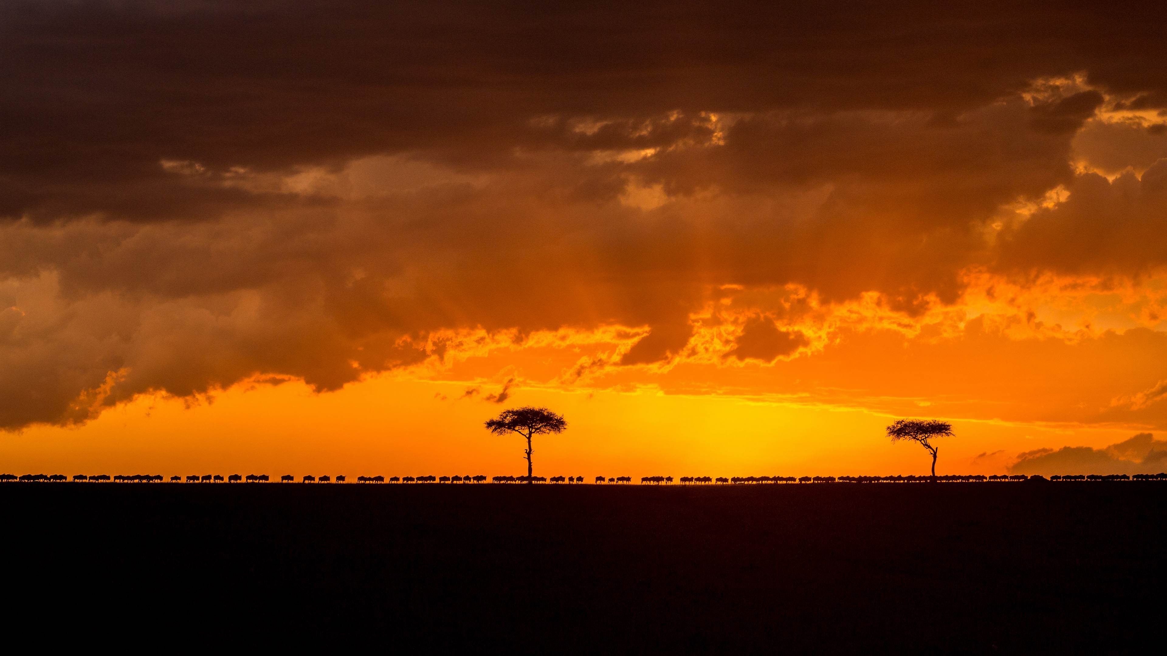 日落时分正在迁徙的斑纹角马群,肯尼亚马赛马拉野生动物保护区 (© Denis-Huot/Minden Pictures)