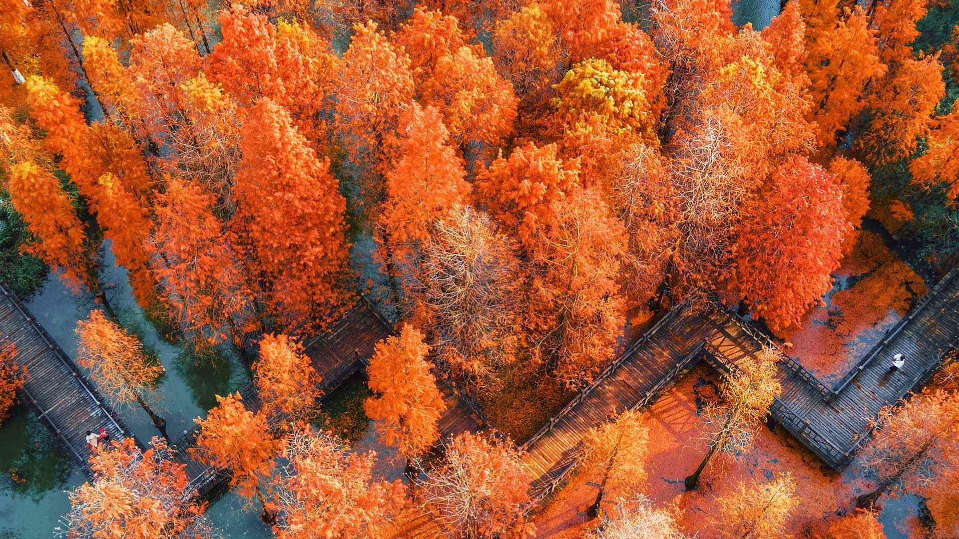 又是一年的秋分时节,众所周知,在这一天,全球各地昼夜的时间几乎是相等的。在幅员辽阔的中国,自南向北开始,秋季在每个地区有着不同颜色和不同的温度。大部分地区雨季在此时刚刚结束,秋天的凉意才刚刚开始,此时正是碧空万里,风和日丽的时节。中国的秋季颜色是叠翠鎏金的,许多植物的颜色由此时节开始,由苍翠的绿转为金黄或者橙红色。<br>今天我们的图片中正是秋季最具代表性的红色落羽杉,它们位于江苏省常州的翠竹公园,每年秋冬季节,落羽杉皆呈现出金黄至橙红色的渐变,搭配九曲回廊与水上栈道,是一派诗意盎然的江南秋季风景。