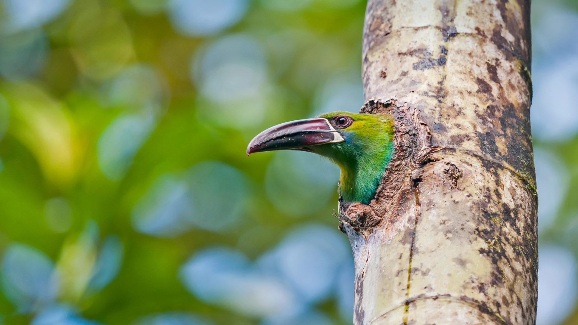 图中的这只小鸟的尾羽上有一小片红色的羽毛,这些羽毛与它身体其它部分的深绿色、金色和有时是蓝色的羽毛形成了鲜明的对比。它就是厄瓜多尔著名的绯腰巨嘴鸟,游客们可以在这个观鸟区任意拍照留念。这个私人的自然保护区位于厄瓜多尔安第斯山脉的山脚下,观鸟是这里一项传统的活动。