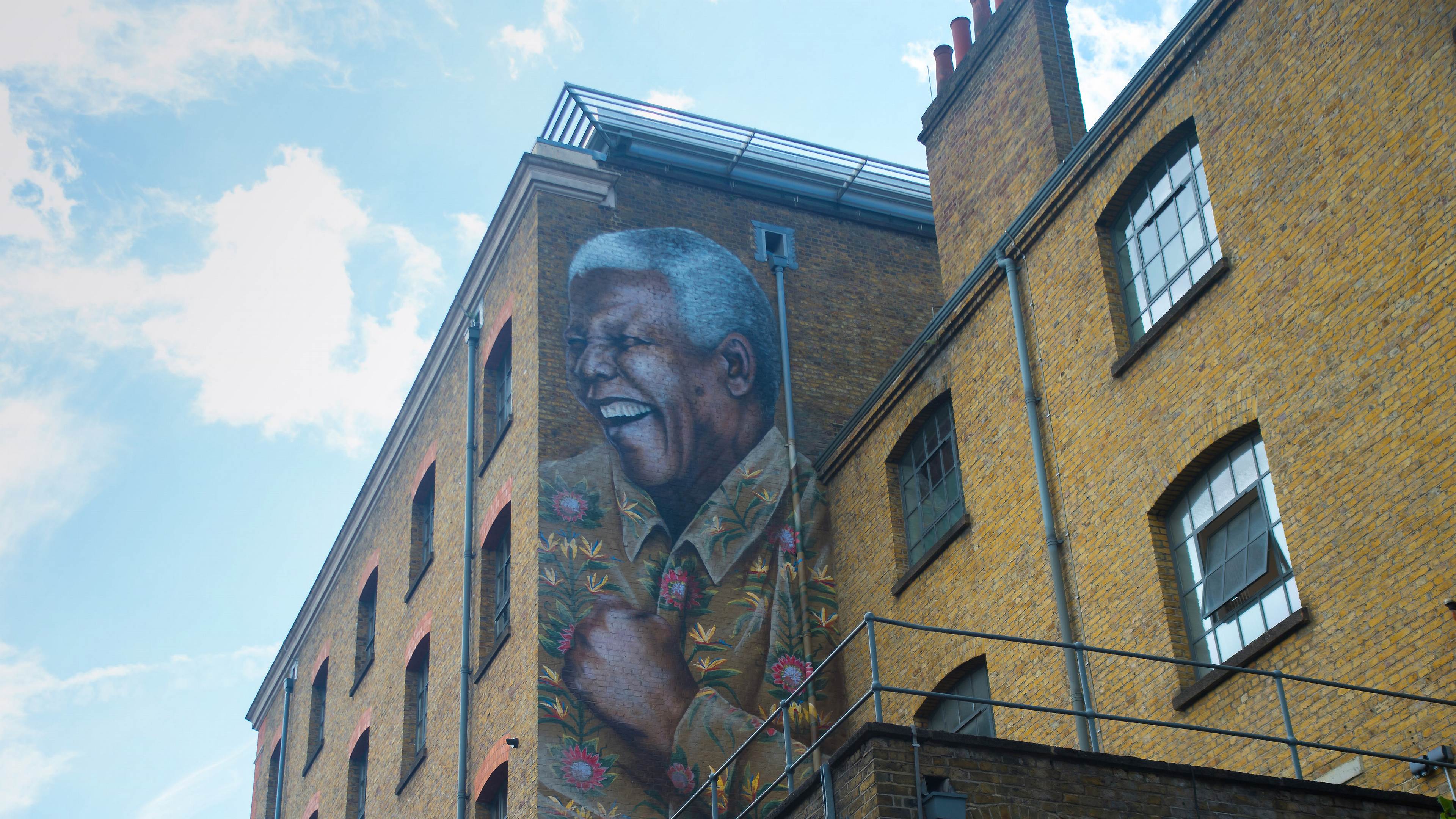 A giant portrait of Nelson Mandela on a wall in Camden, London. (© NurPhoto/Contributor/Getty Images)