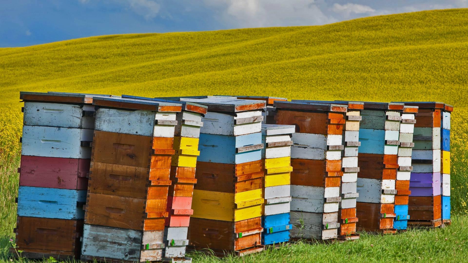 野生蜜蜂群通常在树上和洞穴里筑巢,但人造盒子也能起到同样的作用,自古以来人类就在建造自己的蜂箱。图中所示的现代蜂箱(包括框架)用于容纳蜜蜂产生的蜂巢,这些蜂巢可以用来储存蜂蜜、花粉和幼蜂。当蜜蜂生产了大量的蜂蜜后,养蜂人可以简单地移除框架以提取一些蜂蜜,剩下的蜂蜜就用来喂养蜂巢。有没有觉得这些五彩斑驳的蜂箱在嫩黄的油菜花田旁边显得格外夺目?