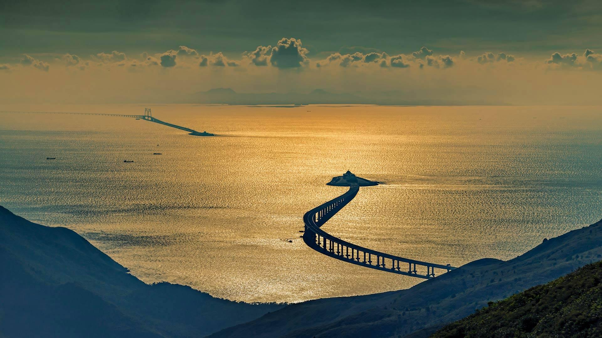 这个雄心勃勃的中国建设项目连接了珠江三角洲的三个主要城市(香港、澳门和珠海)。港珠澳大桥包括三座缆桥和一条隧道,类似于英国和法国之间的隧道,将通勤者带到三角洲水域下面。港珠澳大桥是目前世界上最长的跨海大桥,总长度约55公里。原定于2016年开放,最终于2018年10月建成通车。