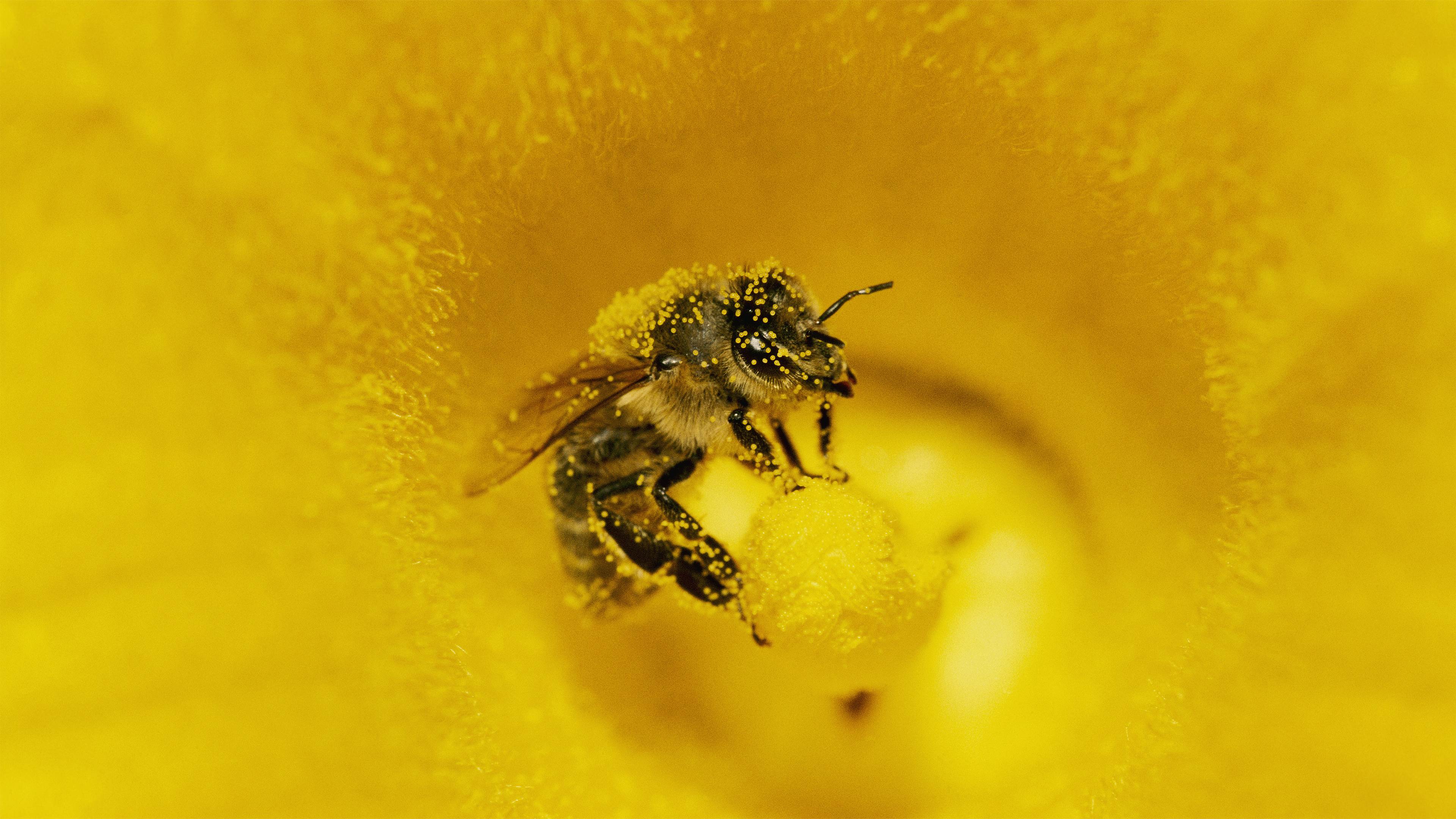 一只身上粘满南瓜花粉的蜜蜂,德国