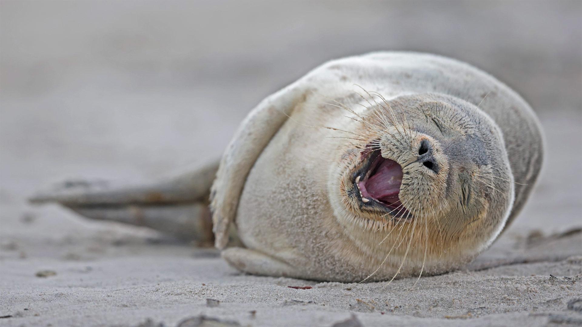 一只躺在沙滩上的港海豹幼崽,德国黑尔戈兰岛