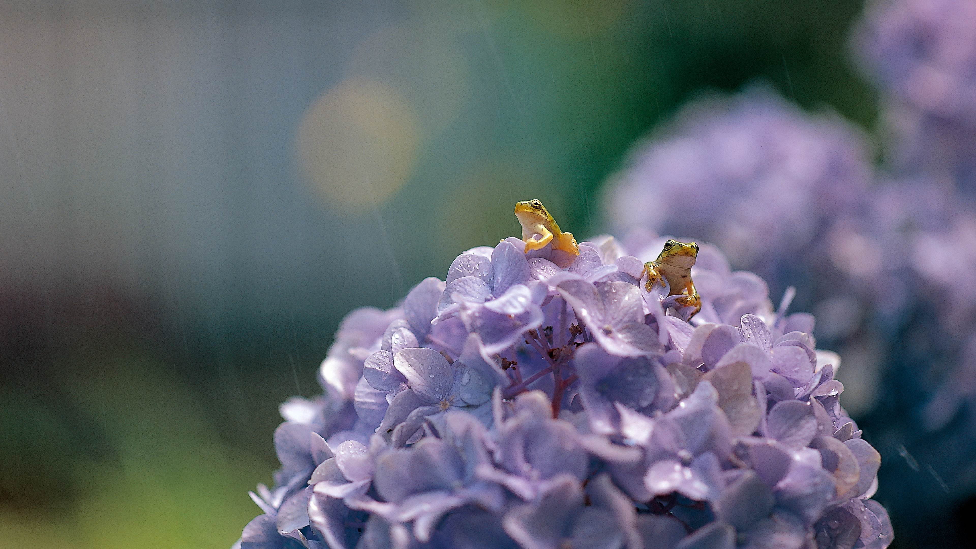 大叶绣球花上的一对日本树蛙,日本滋贺