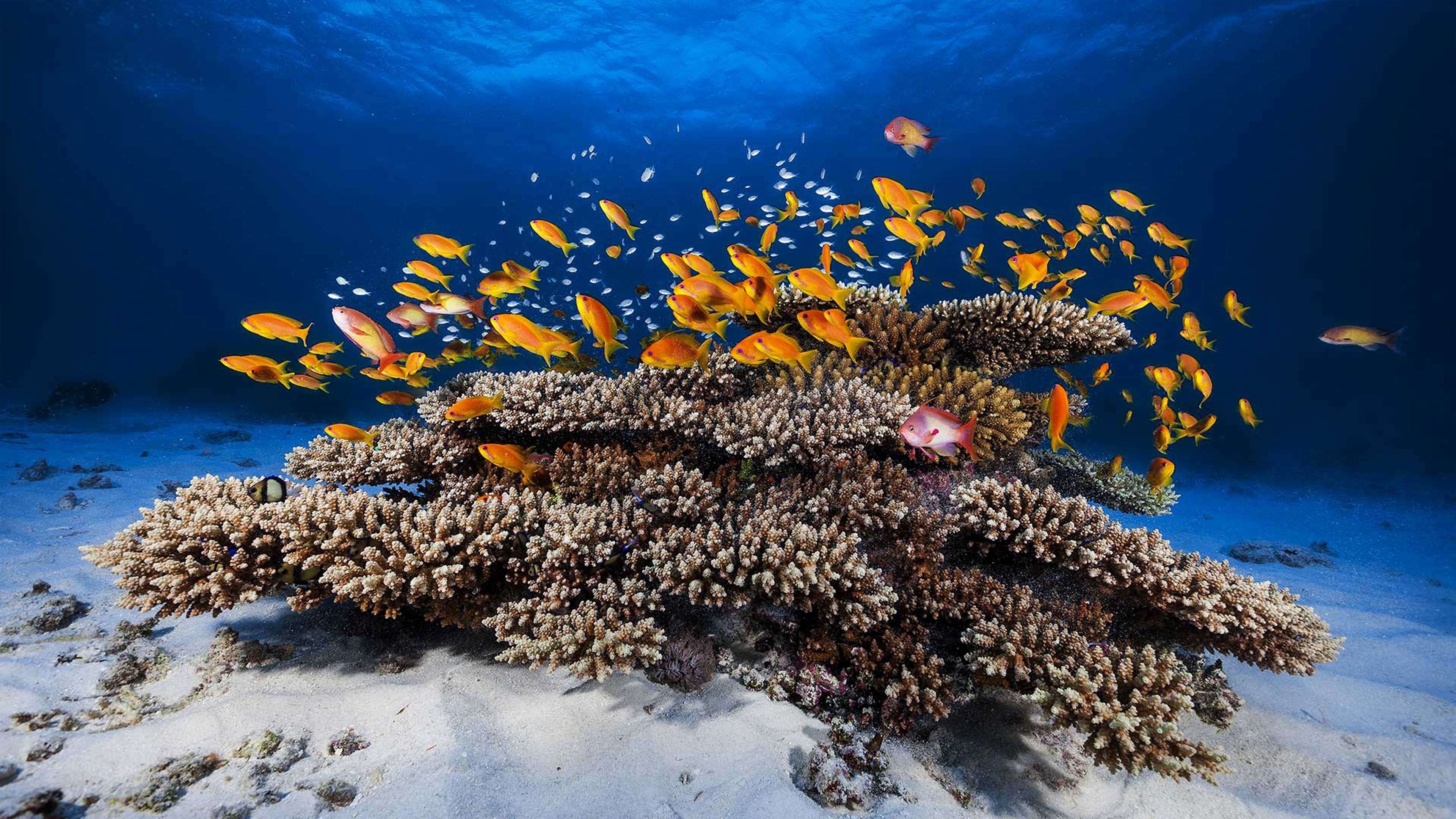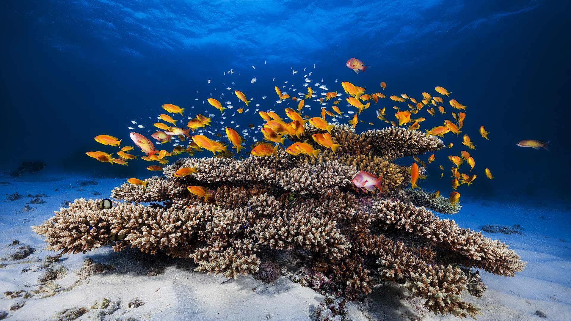 金拟花鮨鱼群游过珊瑚,印度洋马约特岛