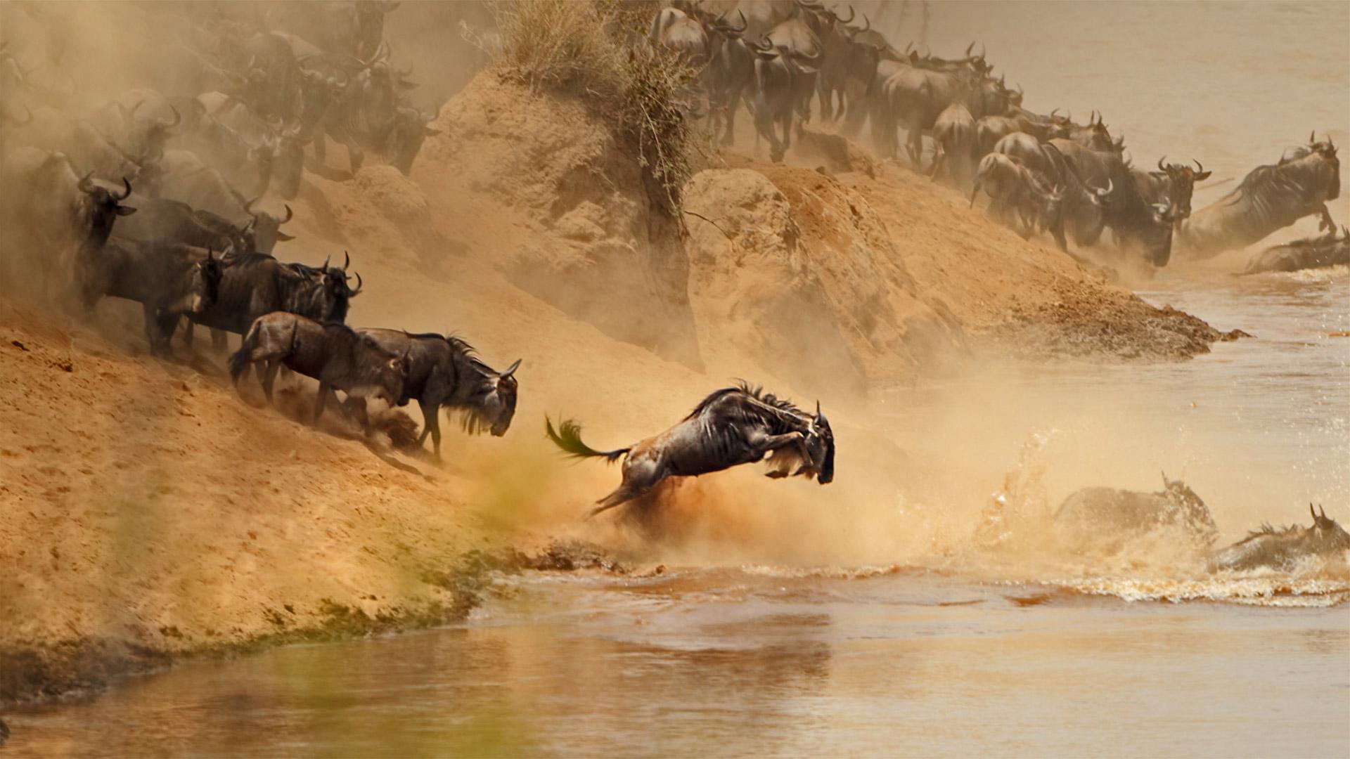 角马群穿越在肯尼亚和坦桑尼亚之间的马拉河