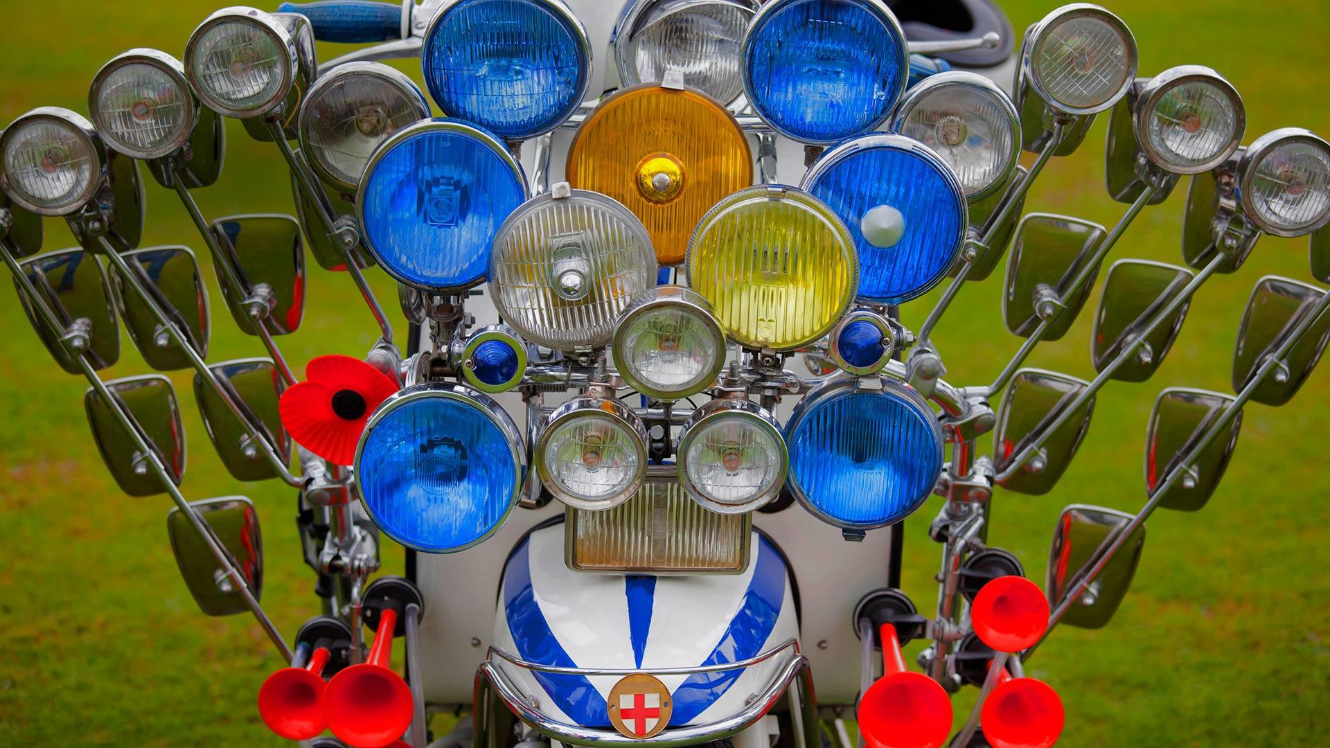 装饰有多个镜子、灯和空气喇叭的摩托车