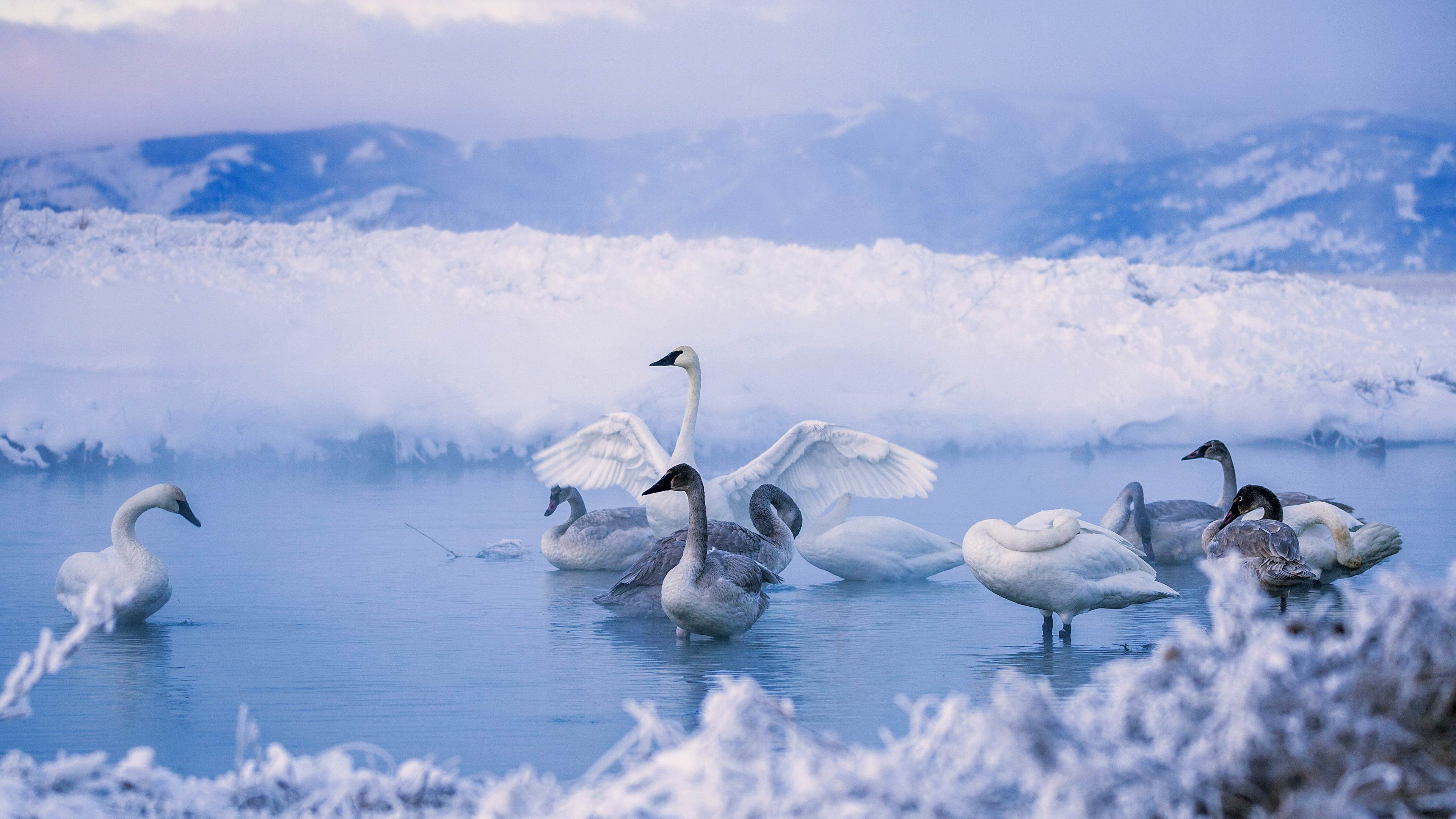 凯利温泉中的黑嘴天鹅,怀俄明州