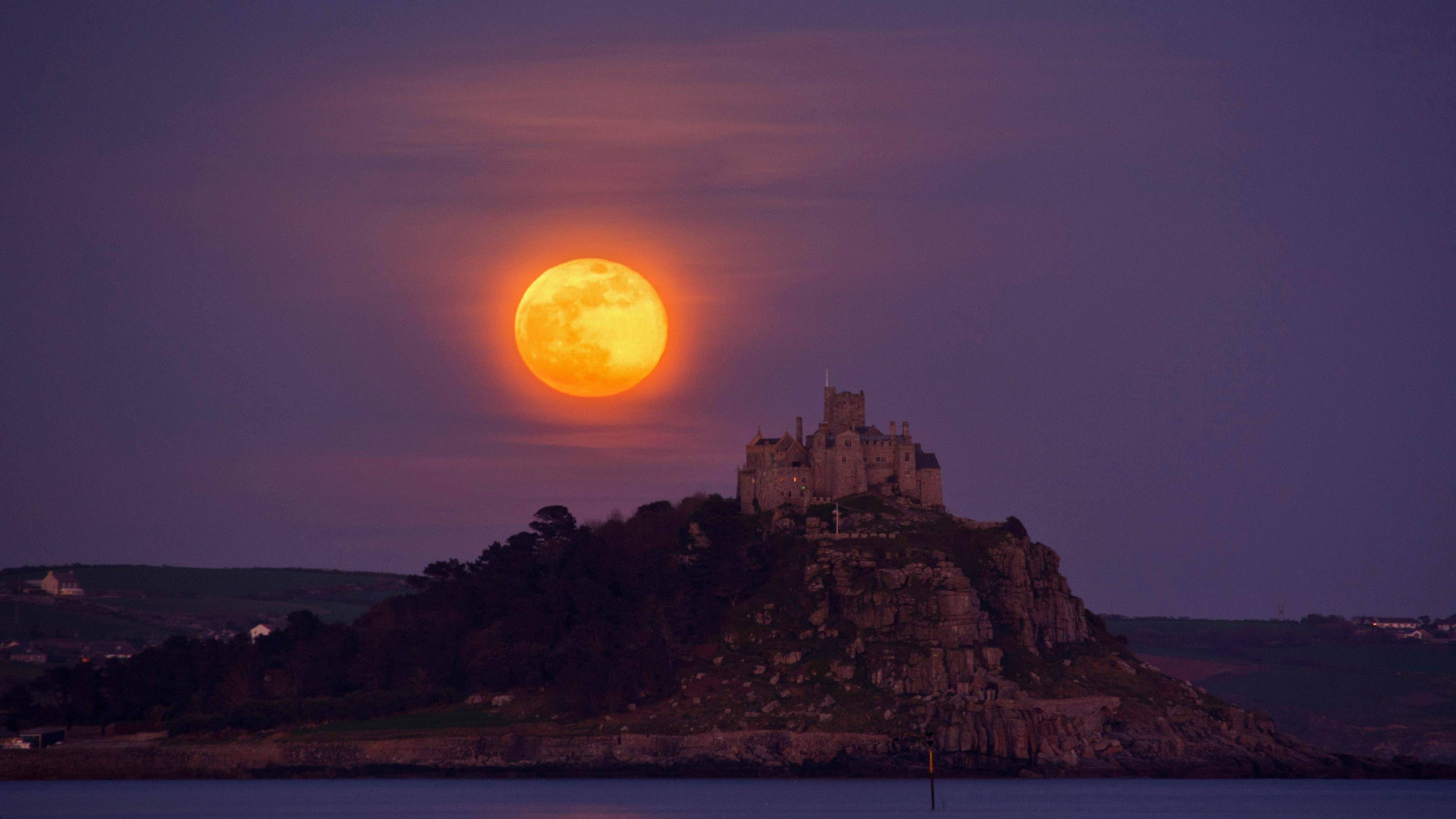 四月的满月从圣迈克尔山上升起,英国康沃尔