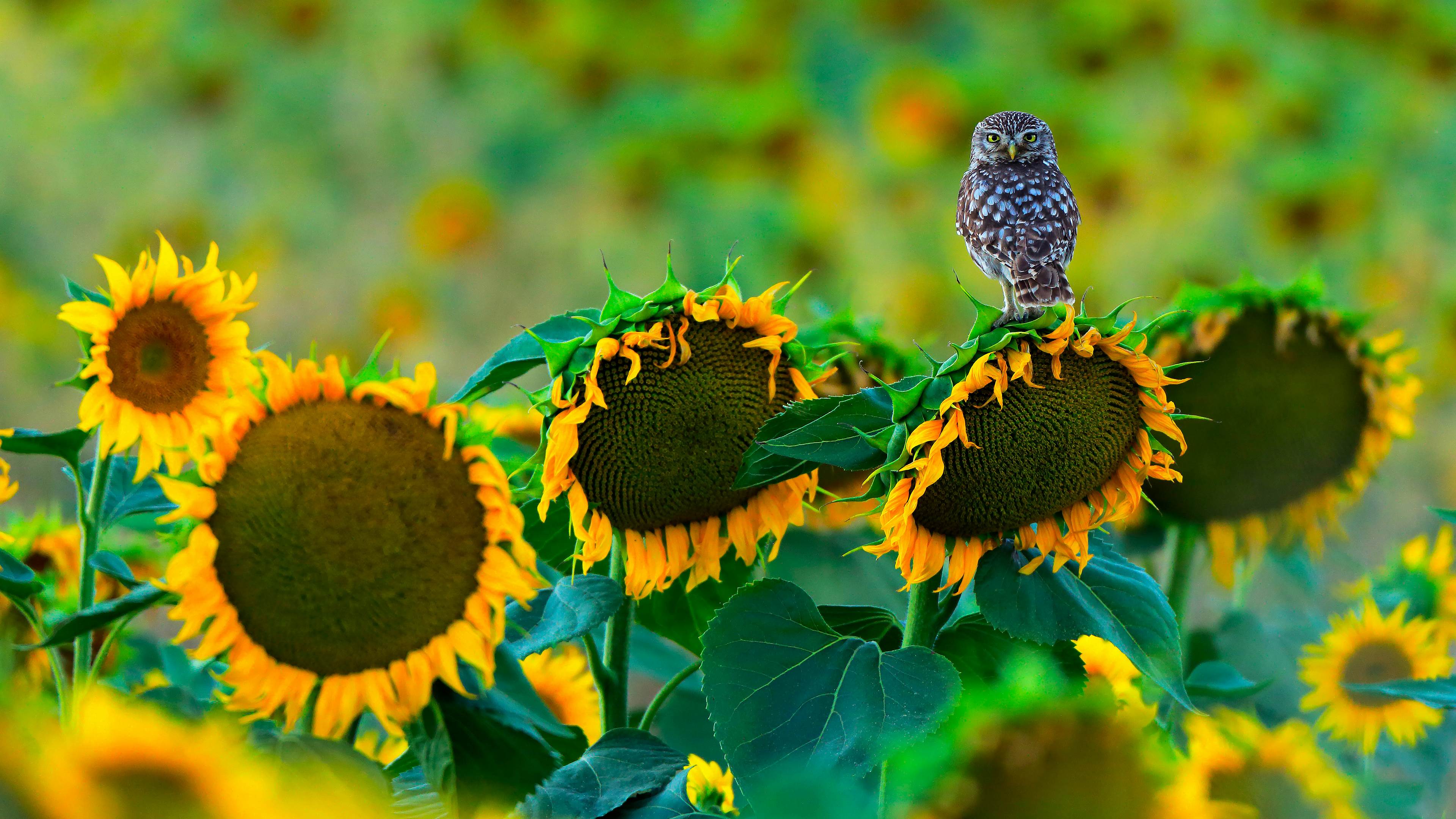 栖息在向日葵上的一只小猫头鹰,西班牙加的斯