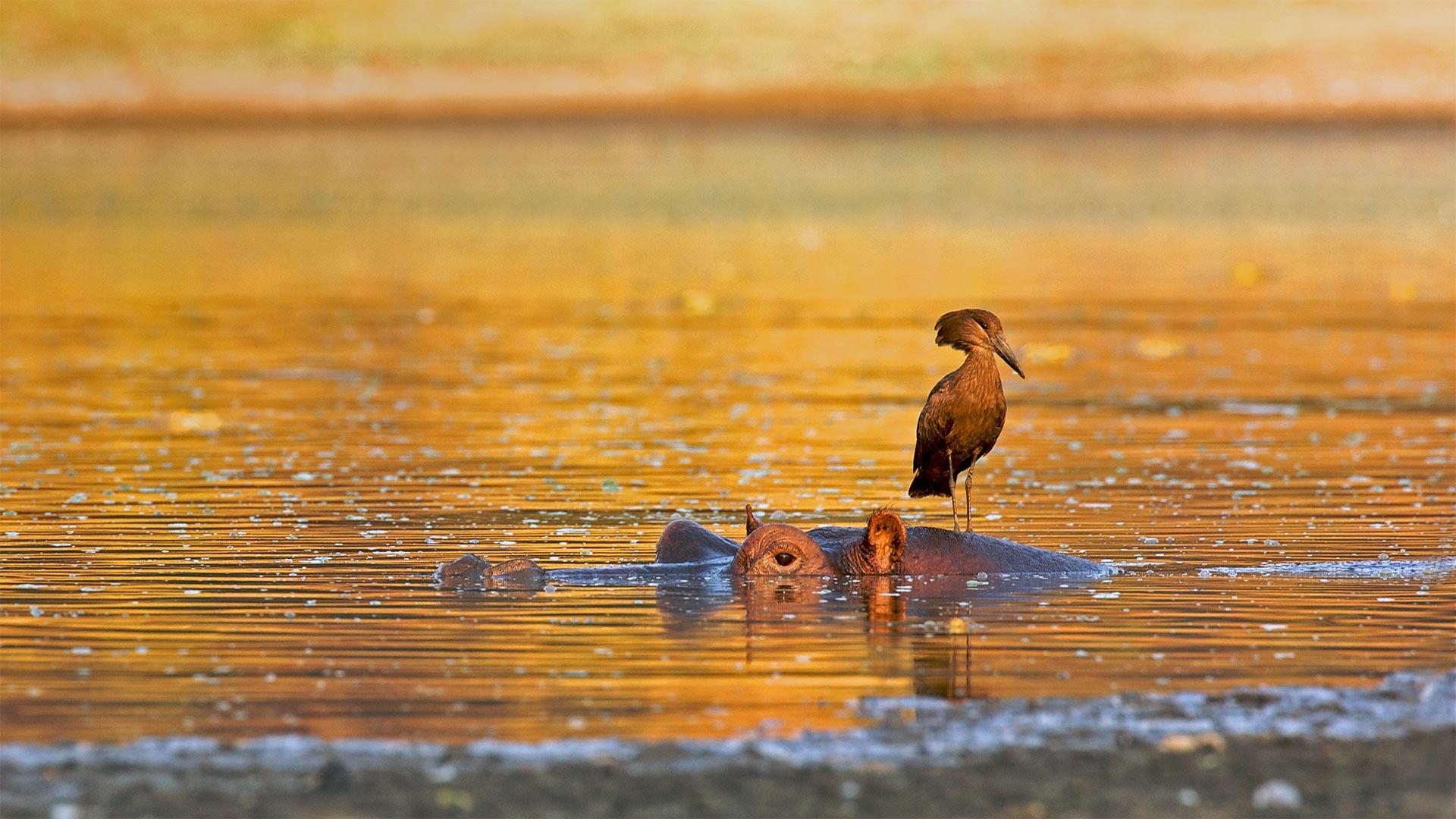 站在河马身上的锤头鹳,津巴布韦马纳潭国家公园