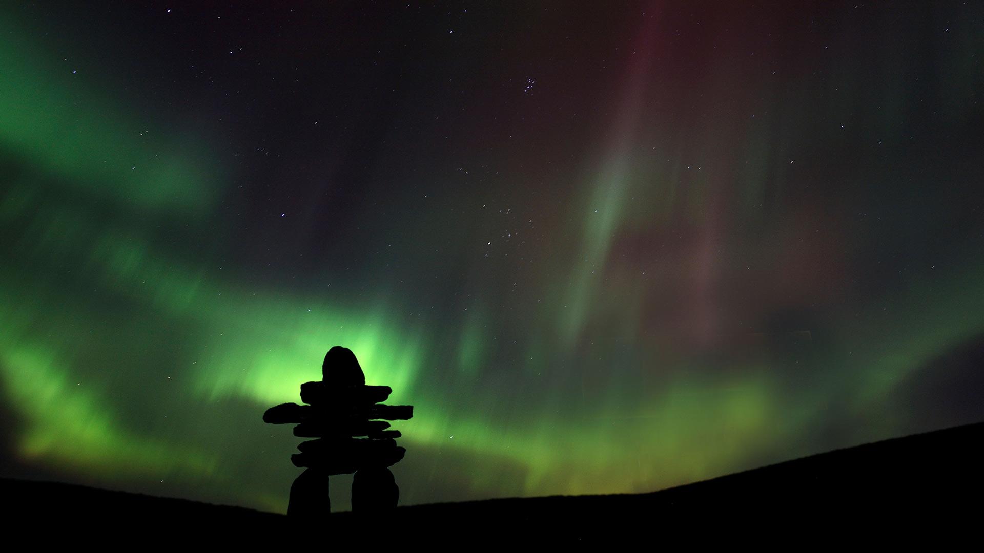 被北极光映衬出轮廓的因努伊特石堆,加拿大西北地区