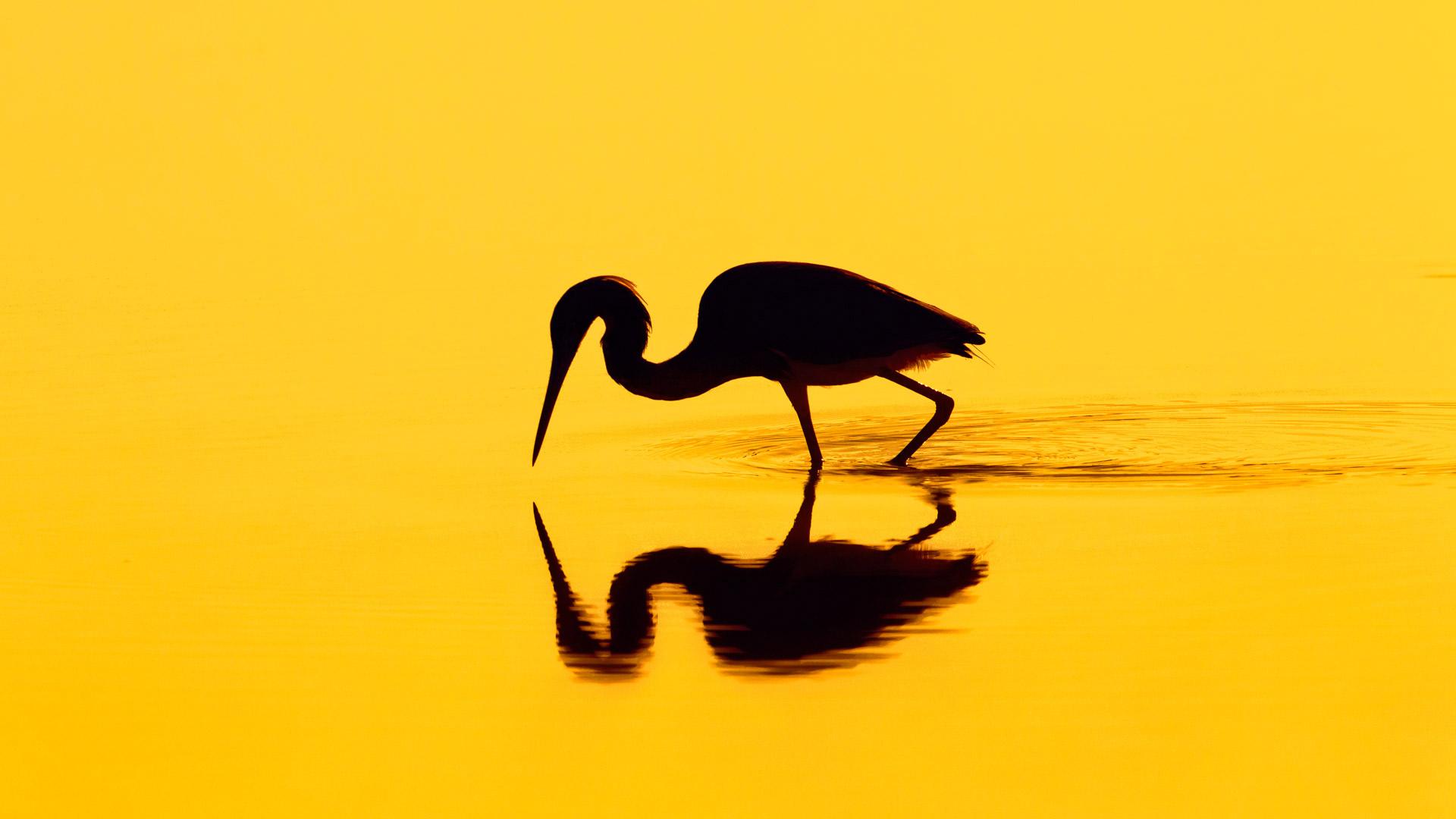 一只苍鹭的剪影 © Don Mammoser/Shutterstock 向阳而立 苍鹭,是体态优雅的大型水鸟。它们时而成群结队地在蓝蓝的天空中翩翩飞舞,时而又拍翅降落在地上或水边休憩。它们扑扇着翅膀奔跑在河边的浅水里,使水面泛起阵阵涟漪,把优美的身影映在清澈的水中。水鸟与湖光景色共同构成了一幅静谧的画卷。 它们 一只 静谧 优雅 清澈 画卷 成群结队 苍鹭 剪影 浅水 时而 涟漪 降落 水边 休憩