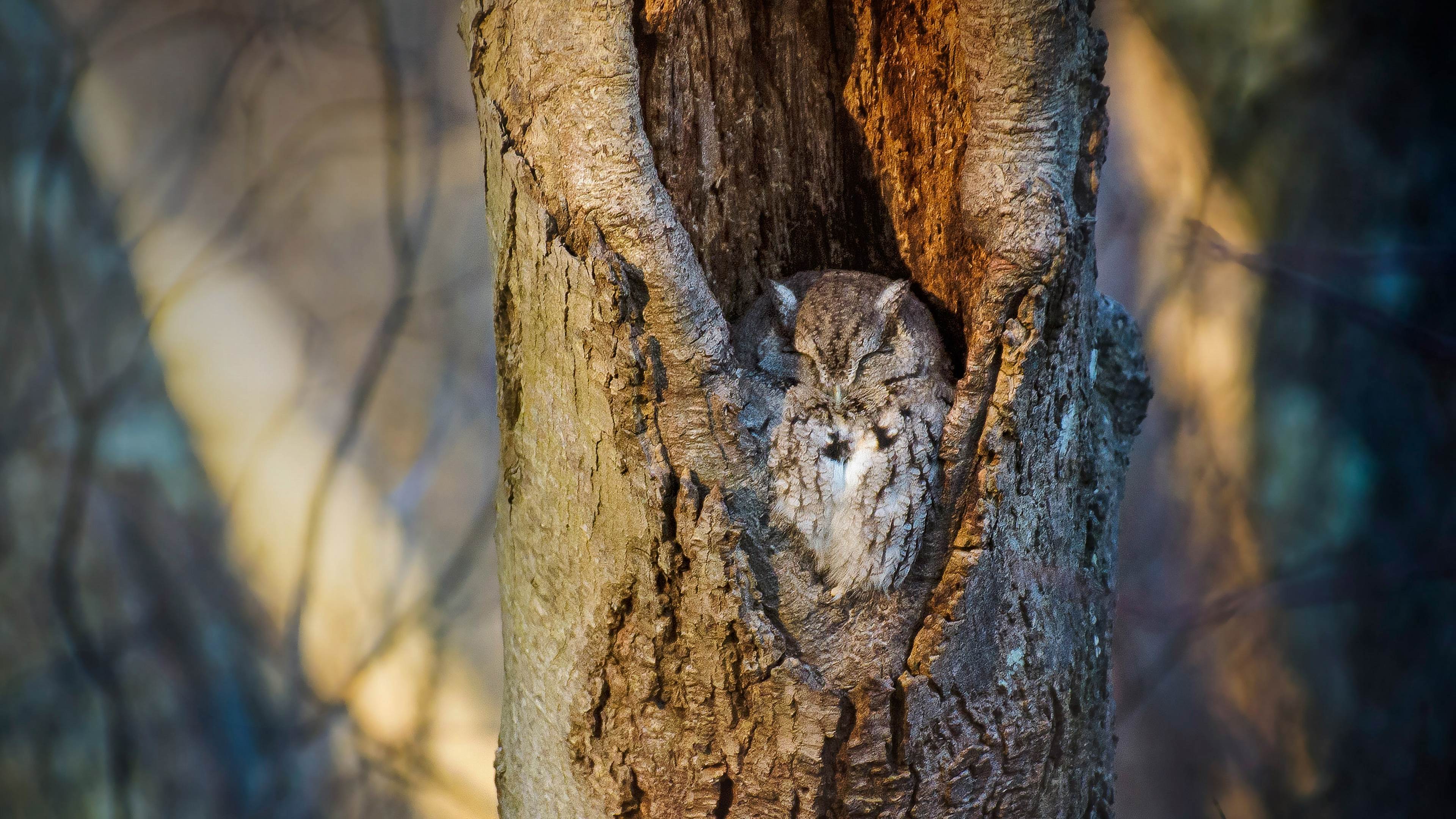 在树洞中休息的鸣角鸮,纽约马萨皮夸保护区