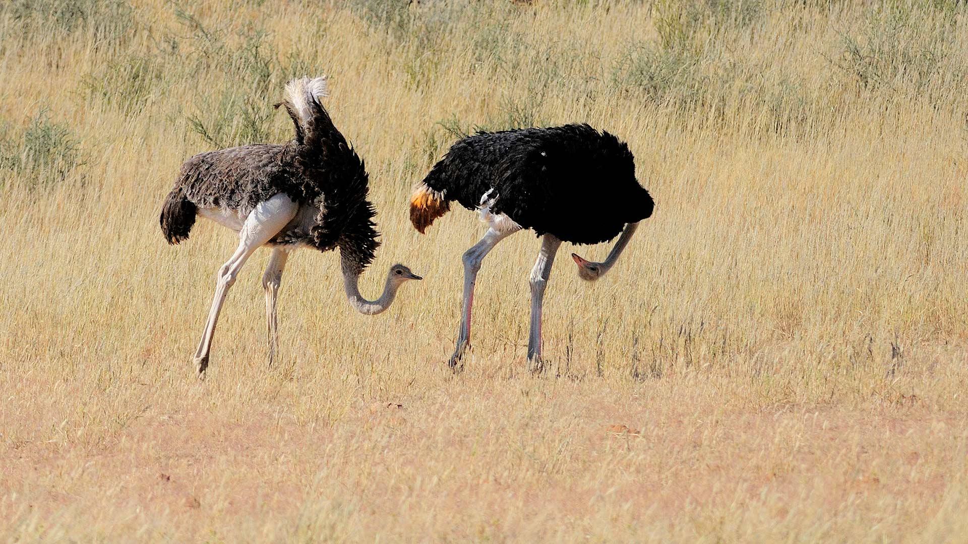 卡格拉格帝边境公园中一对正在求偶的鸵鸟,南非
