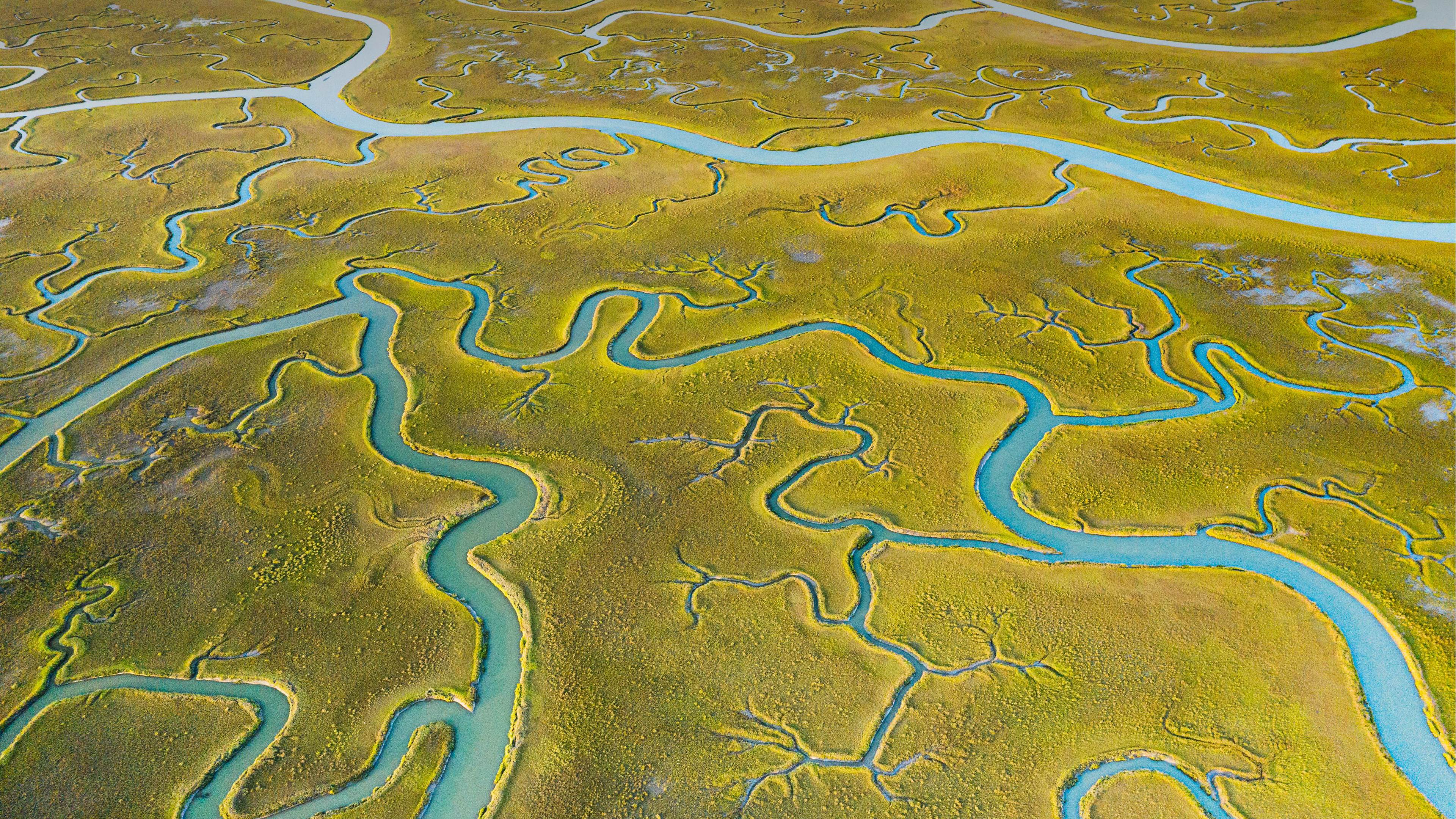 鸟瞰Mockhorn岛野生动植物管理区沼泽地内的潮汐通道,弗吉尼亚 © Shane Gross/Minden Pictures 鸟瞰Mockhorn岛野生动植物管理区沼泽地内的潮汐通道,弗吉尼亚 野生 鸟瞰 沼泽地 动植物 潮汐 通道 Mockhorn 管理区 弗吉尼亚