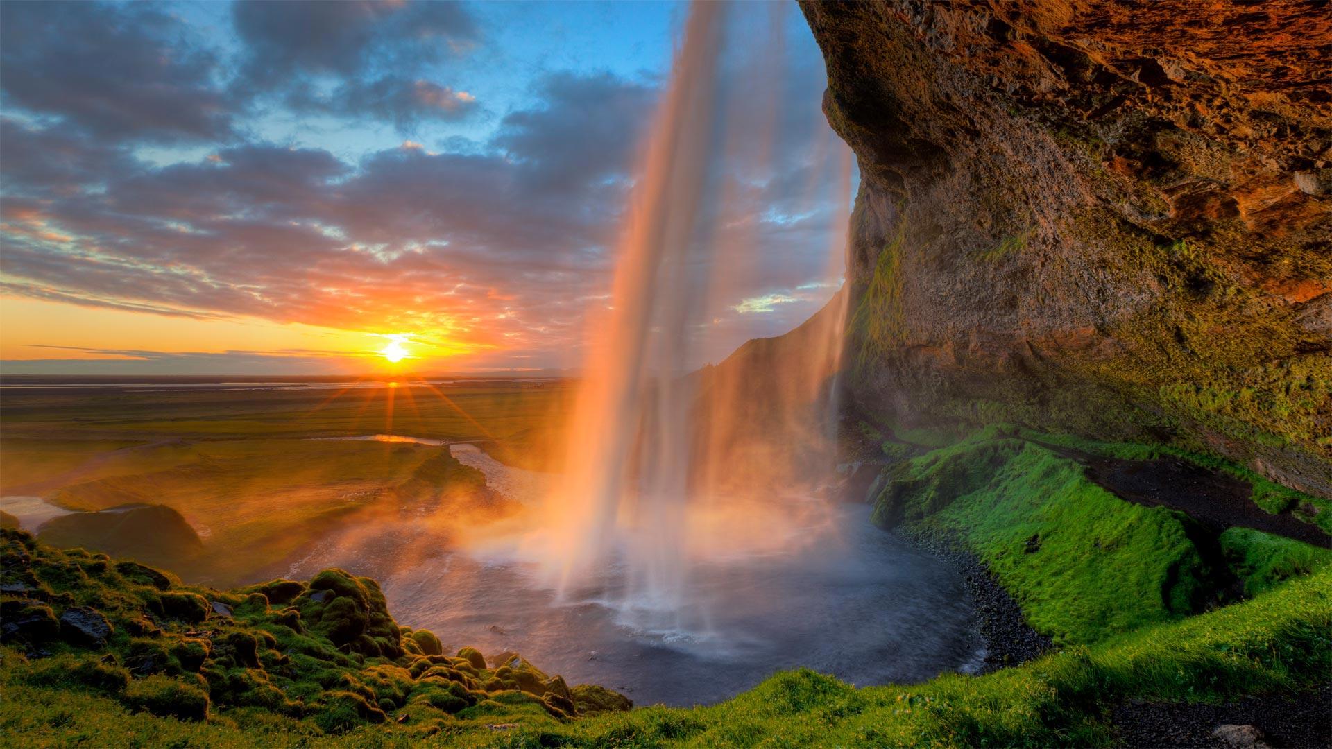 塞里雅兰瀑布后的午夜太阳,冰岛南海岸附近