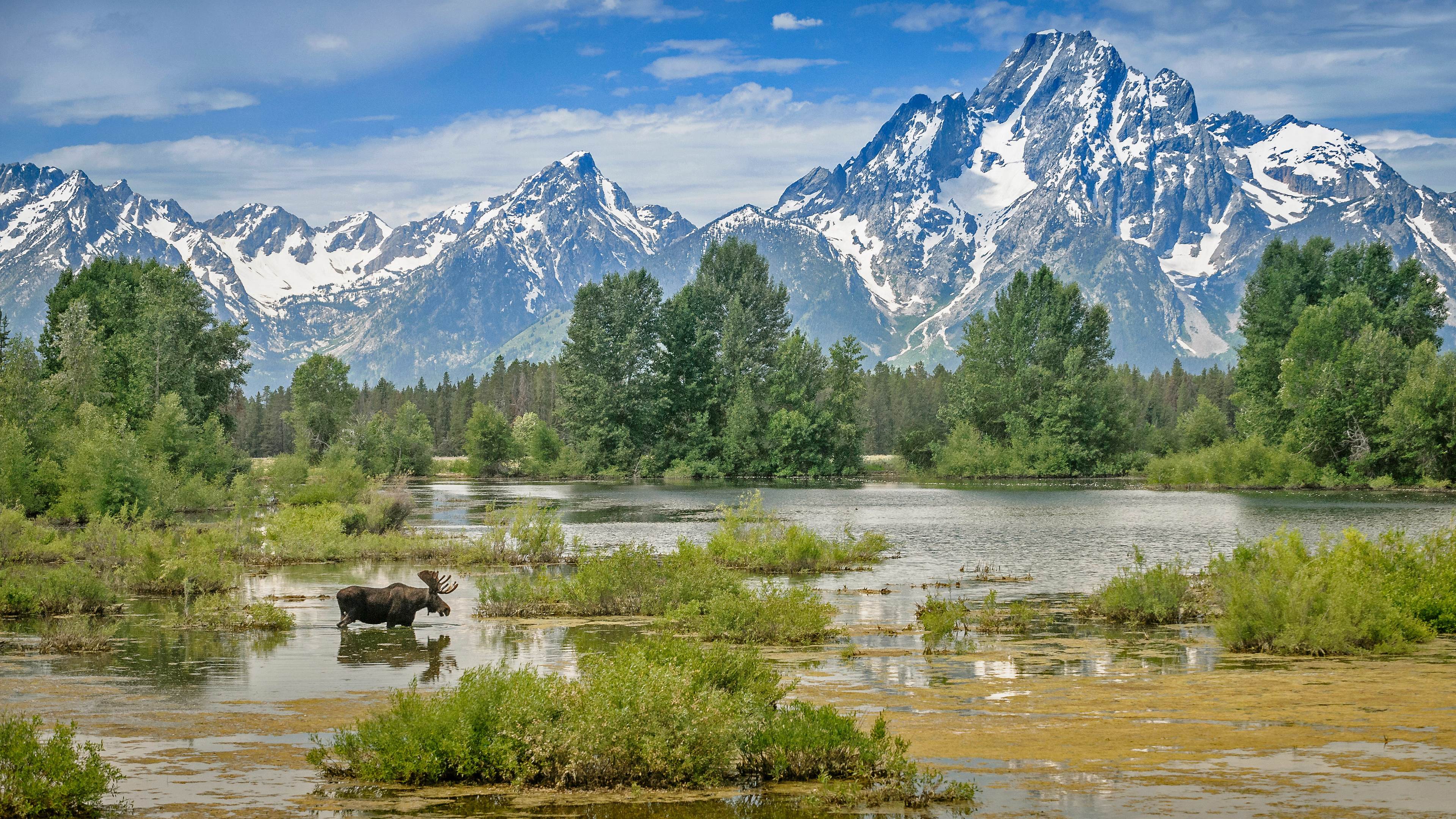 驼鹿穿过莫兰山下的池塘,怀俄明州大提顿国家公园