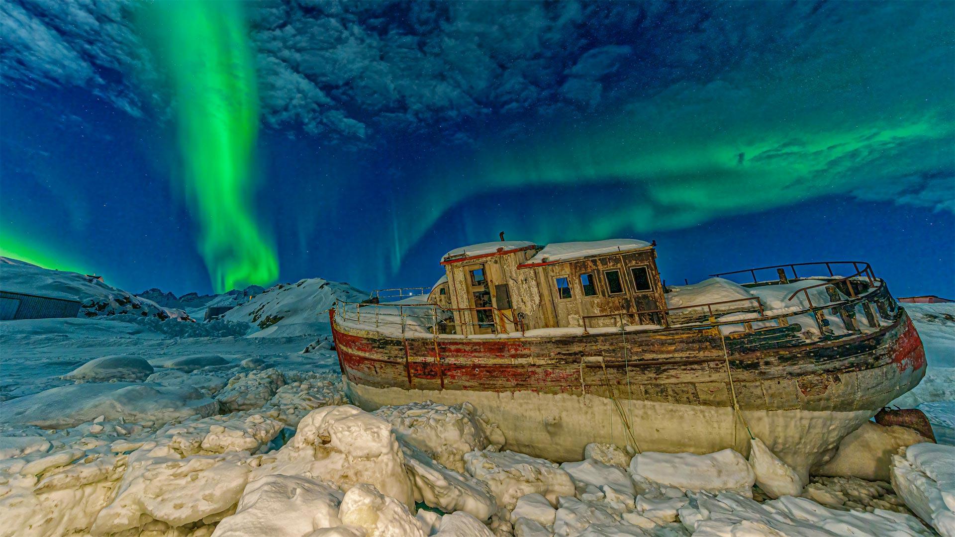 搁浅船只上空的极光,格陵兰岛塔西拉克