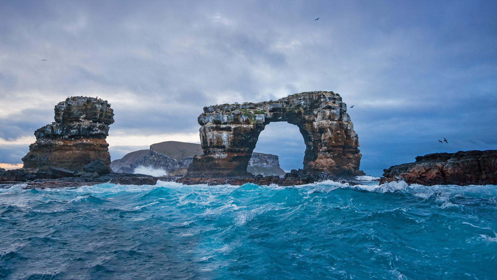海洋拱门遍布世界各地,通常位于悬崖和海水的交界处。悬崖底部的岩石被海浪侵蚀,顶部岩石被保留,便形成了拱门形状。达尔文拱门位于达尔文岛东南部,属于太平洋加拉帕戈斯群岛的一部分。