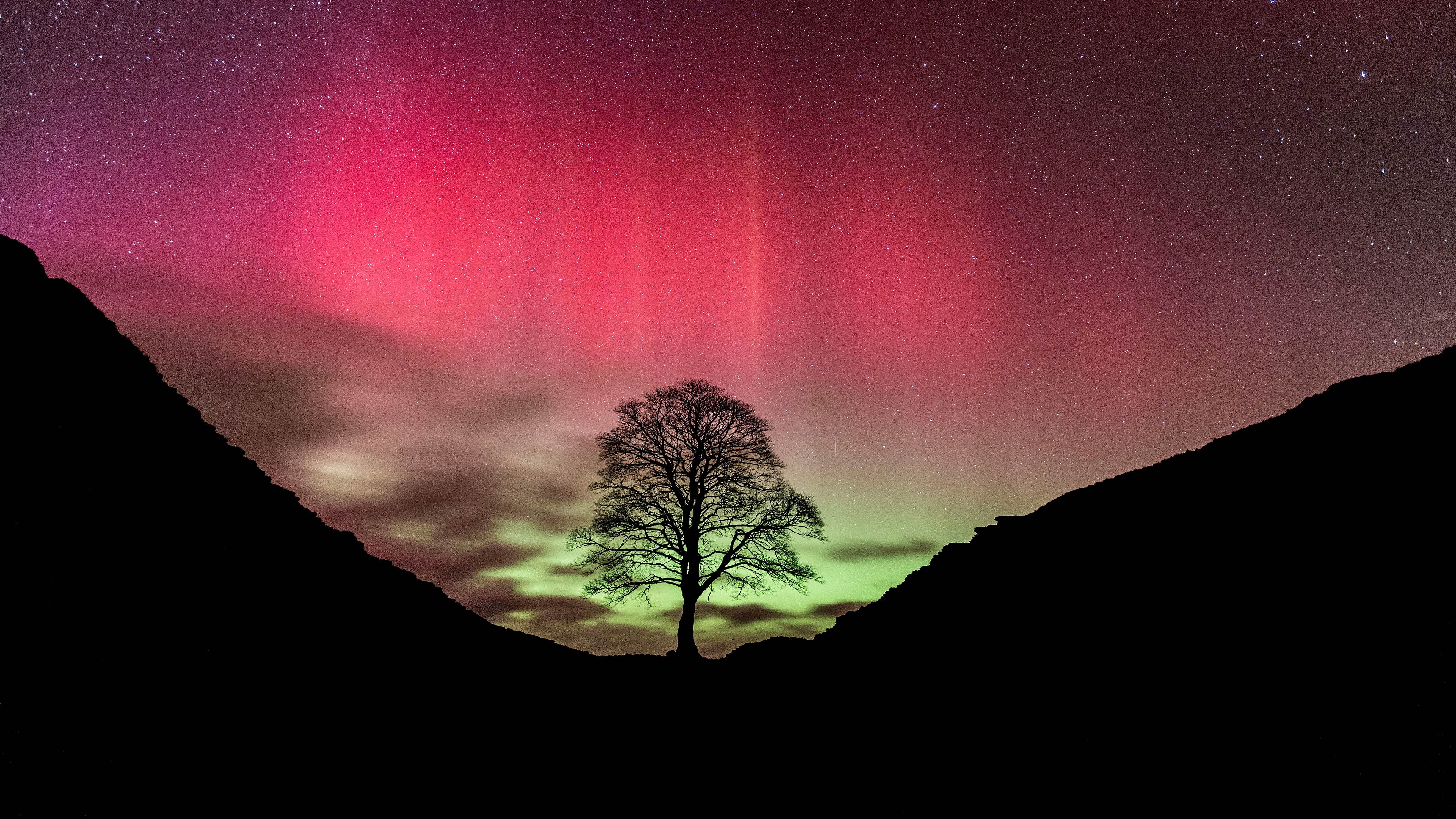 在诺森伯兰郡著名的梧桐峡步道,北极光照亮了天空。 这棵树数百年来一直在哈德良长城陡峭的底部,总是孤独的守夜,哈德良长城是一座 73 英里长的防御工事,旨在标记罗马帝国的西北边境。 它映衬在天空中,据说是诺森伯兰国家公园拍摄最多的地方。