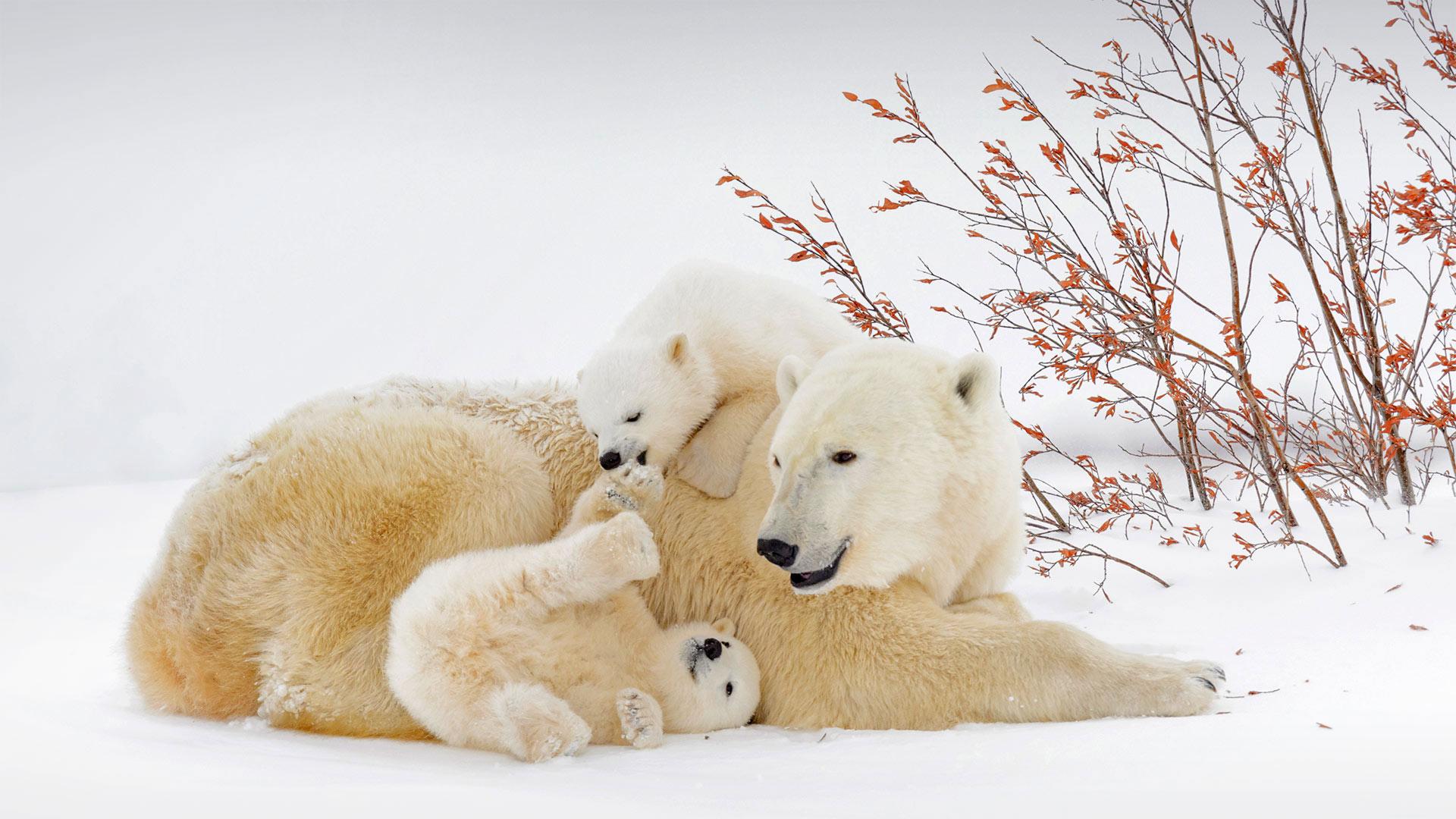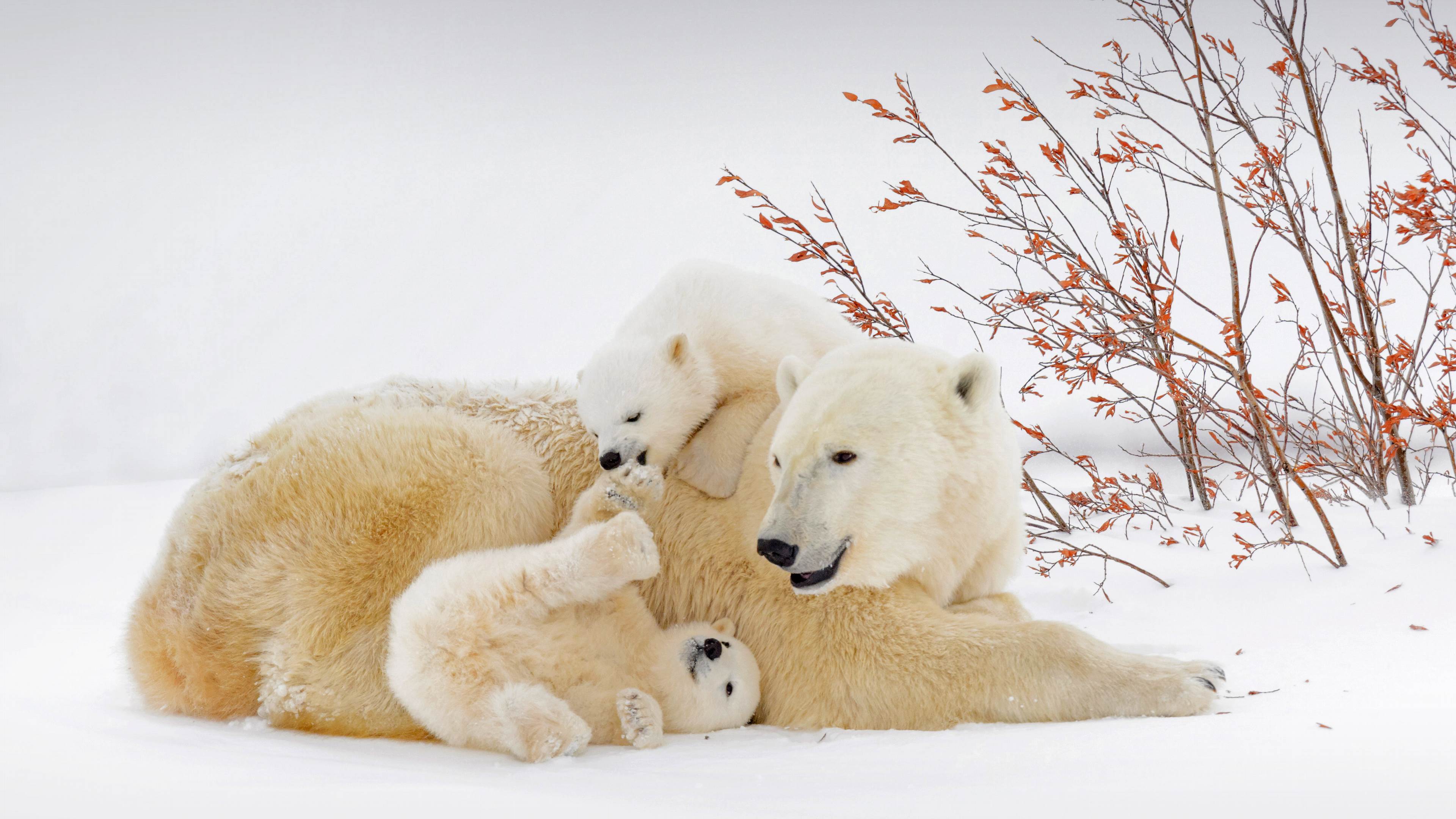 在妈妈身旁玩耍的北极熊宝宝们,加拿大曼尼托巴省
