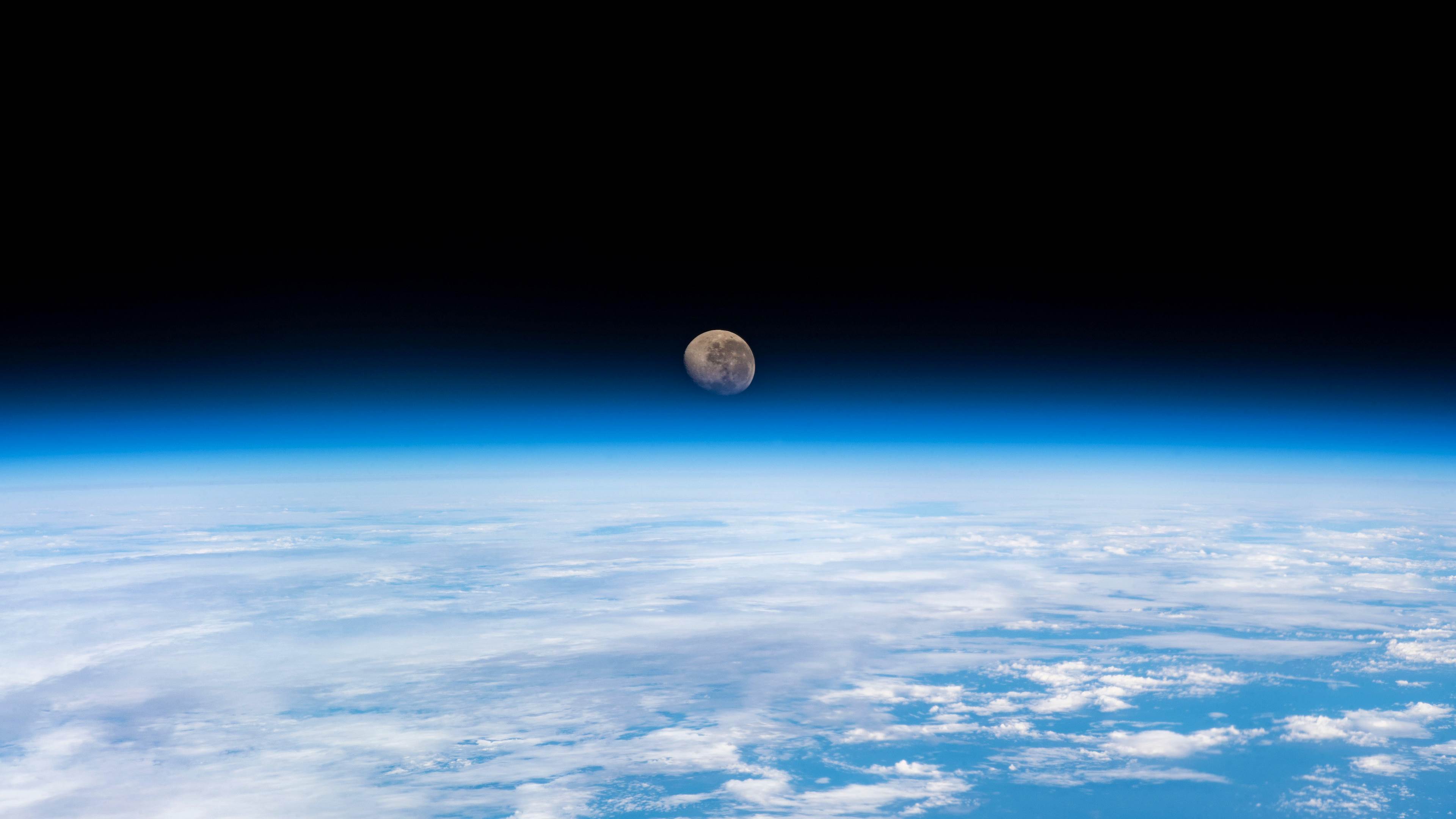 从国际空间站拍摄到的地球上方的渐亏凸月