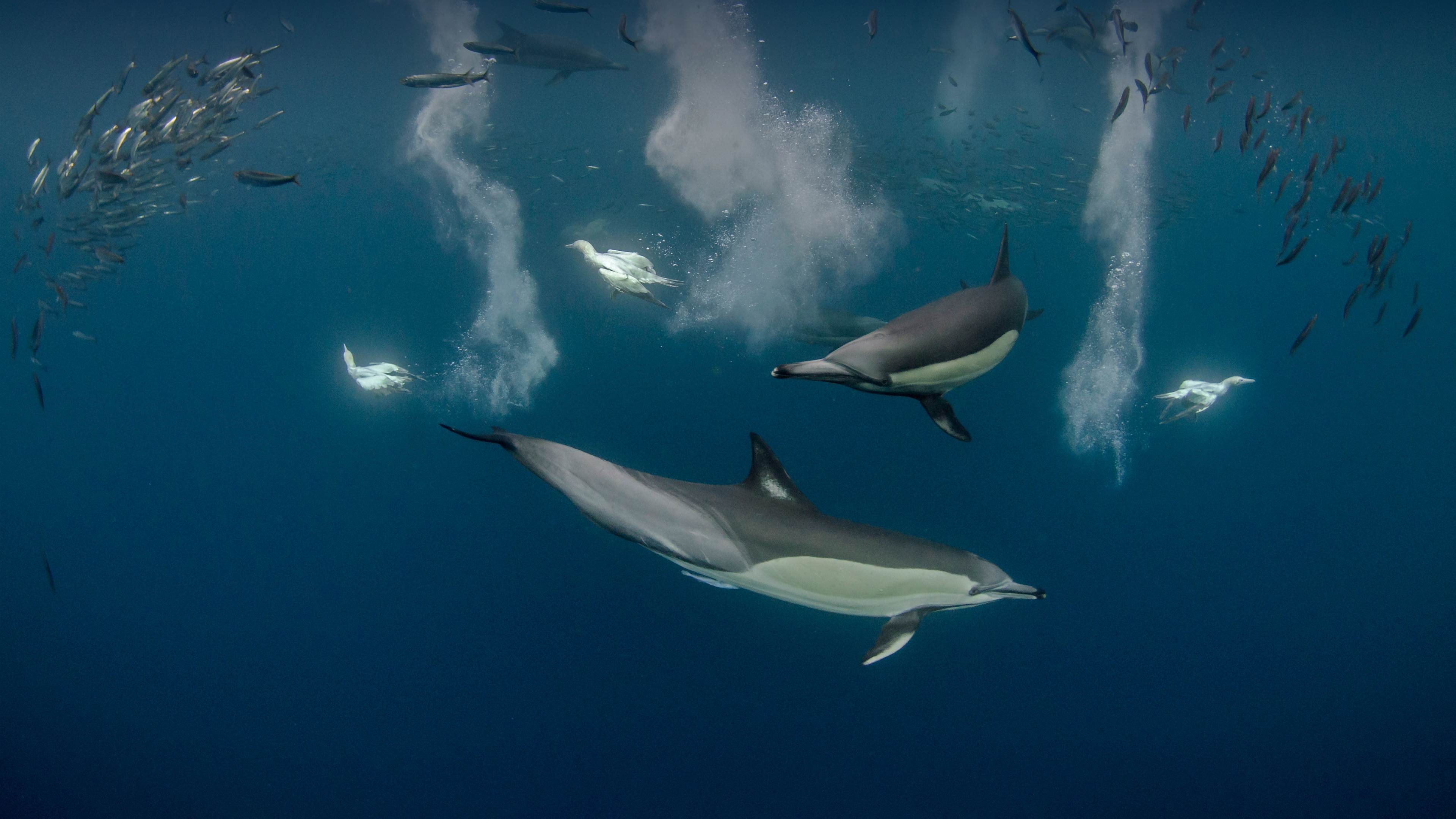 在世界海洋日这天,我们邀请你到海底共进晚餐,由这些长吻真海豚来招待。这群海豚生活在南非东开普省的沿海,它们采用了一种巧妙的狩猎技术,将一群太平洋沙丁鱼驱赶到水面上使得它们无处可逃,基本上就是把它们逼到了墙角。一旦被困在水面附近,沙丁鱼就很容易成为饥饿的海豚和其他幸运的旁观者的猎物,比如这些南非鲣鸟,它们会迅速抓住机会。当然,这项狩猎技术需要团队合作,不过这对海豚来说很容易,它们素来以高智商和紧密的家族联系而闻名。