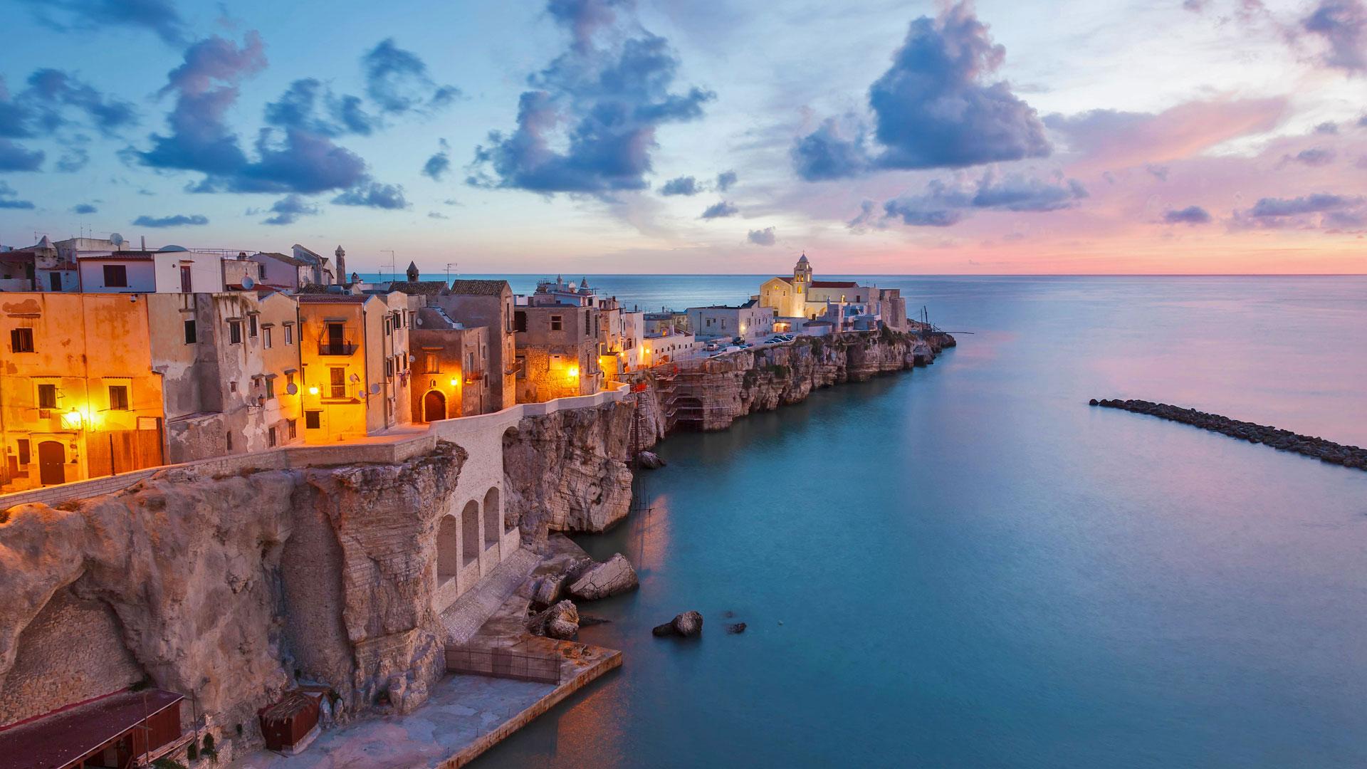 在意大利亚得里亚海海岸上的维耶斯泰小镇 © Peter Adams Photography Ltd/Alamy 醉人的意式风情 普利亚是意大利东南部的一个大区,这里的景色在意大利讲起来,应该算是怪咖了。除了意大利特有的壮丽景色,这里的建筑有着外星球般的梦幻,维耶斯泰小镇,中世纪的城镇里蜿蜒起伏的街巷,海边悬崖上,一轮中秋明月,铺满整个海港,看醉了,看呆了…… 这里 意大利 海岸 小镇 悬崖 景色 壮丽 大区 利亚 星球 亚得里亚海 中秋 海边 蜿蜒 梦幻