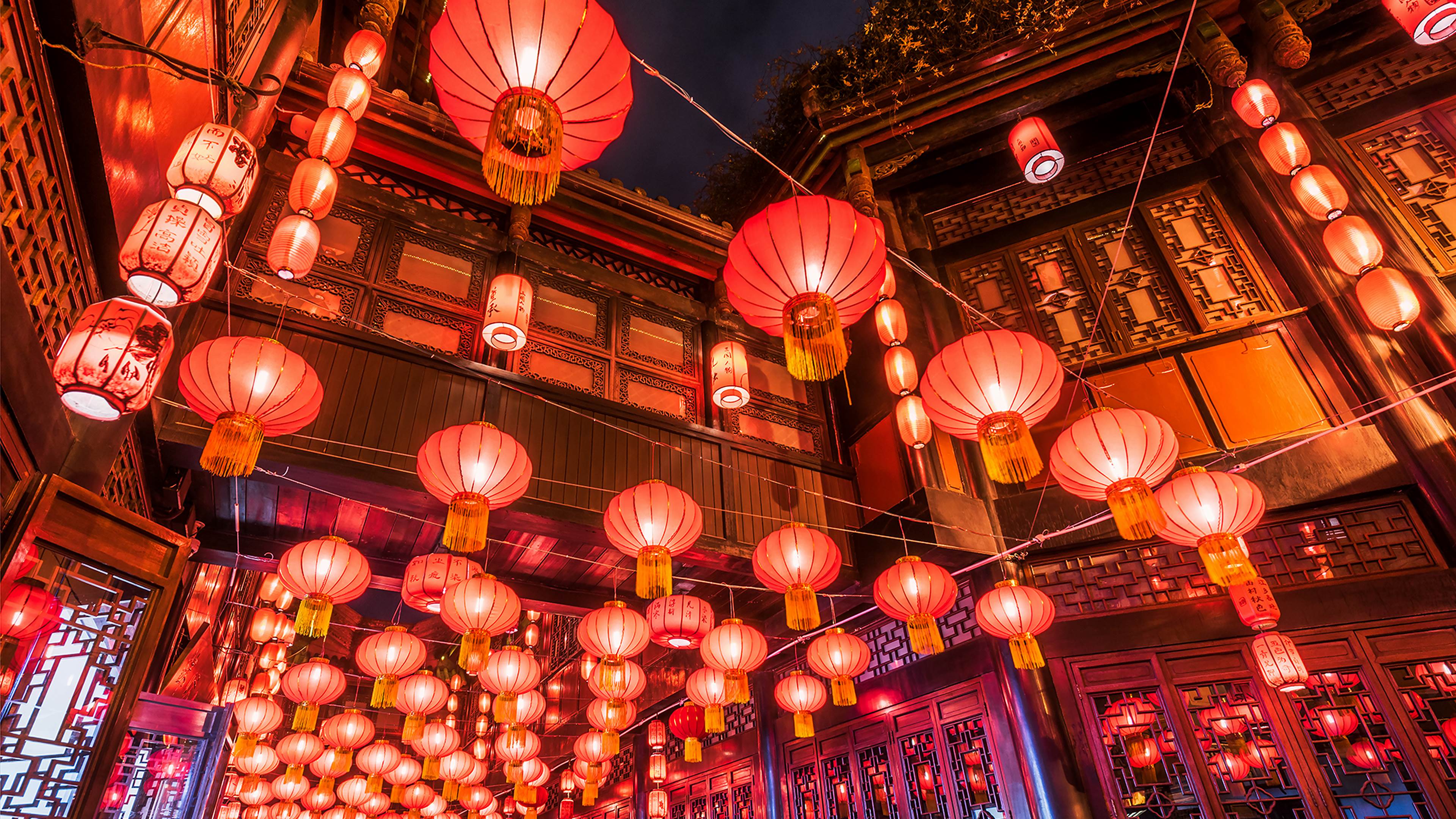 锦里街上悬挂的红色中国灯笼,成都,中国四川省