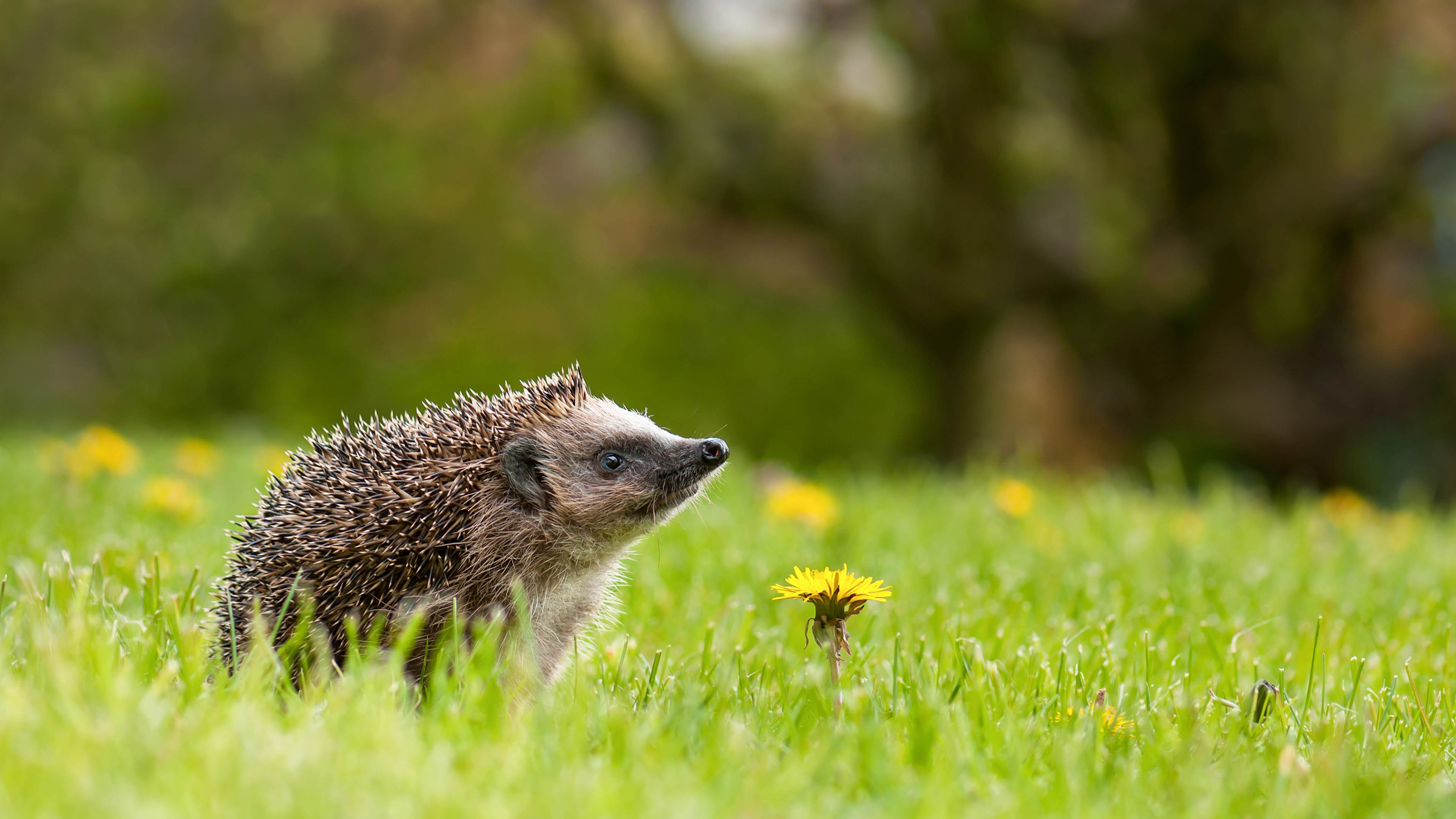 欧洲刺猬在长满蒲公英的花园里,巴特德里堡,德国
