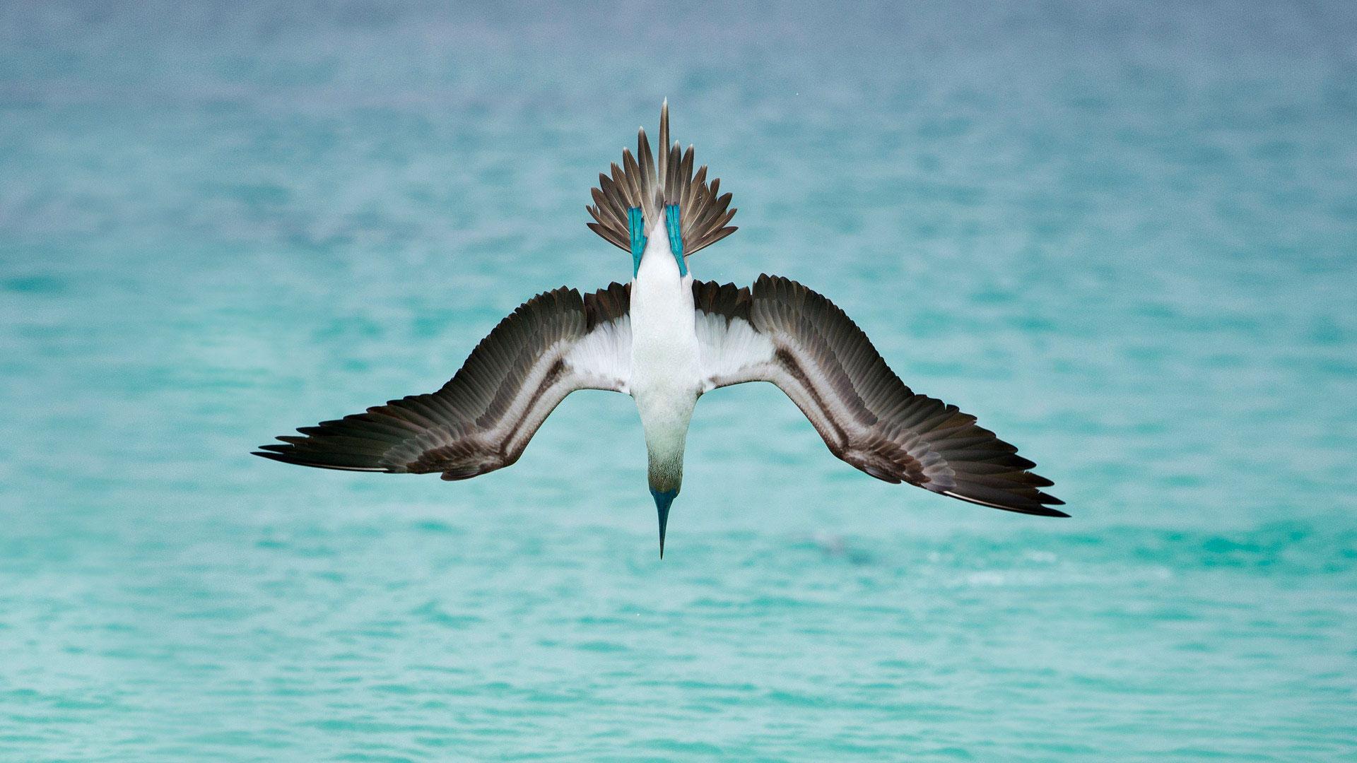 一只在圣克里斯托巴尔岛潜水的蓝脚鲣鸟,厄瓜多尔