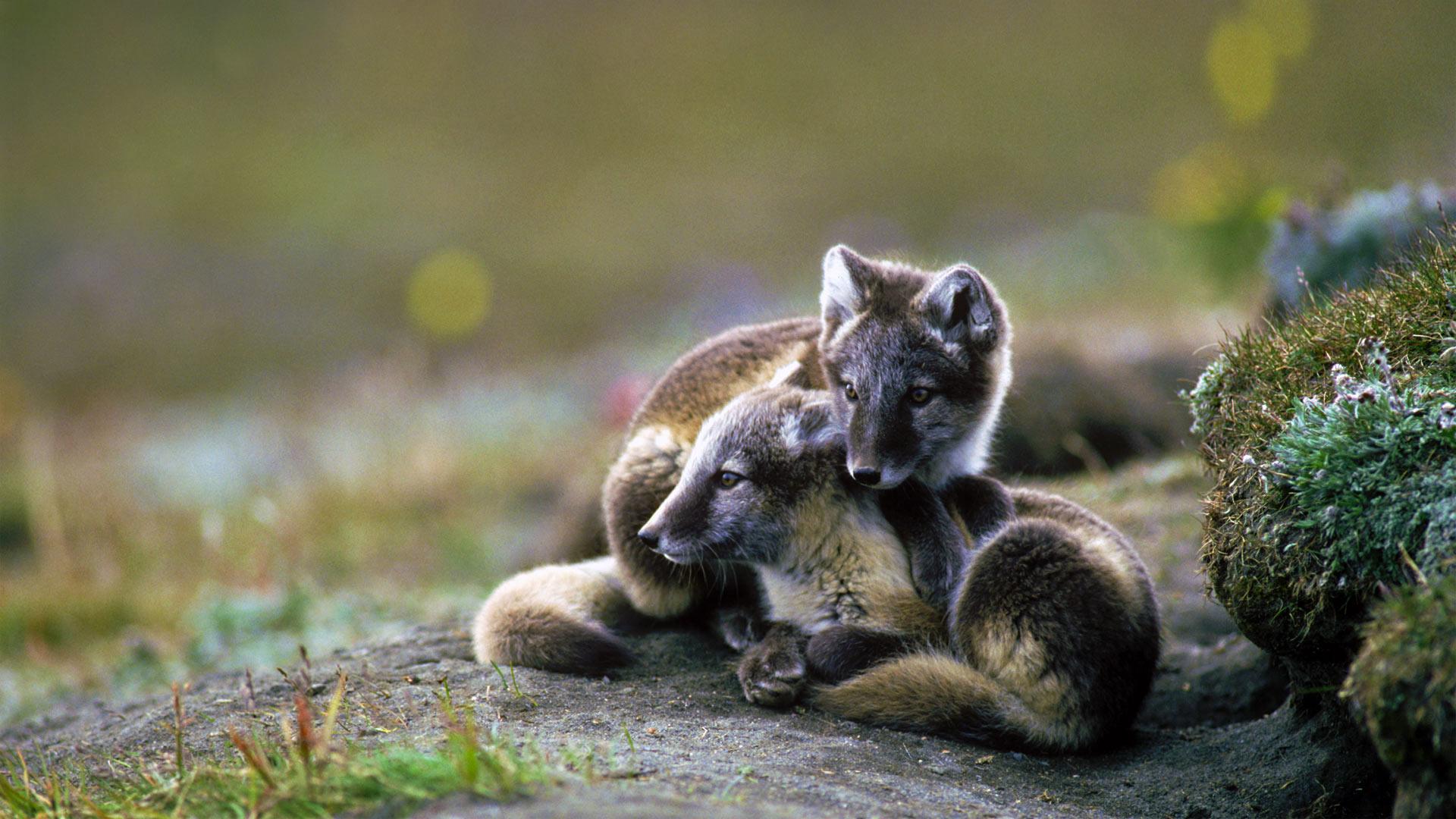 几只北极狐正在悠闲的庆祝今天的兄弟姐妹日。这些北极狐住在阿拉斯加附近的俄罗斯北部岛屿弗兰格尔岛上。北极狐幼崽在9周龄时就断奶,但它们享受着来自爸爸和妈妈以及家中其它成年狐狸的保护。当幼崽准备好自己搜寻小的啮齿动物时,成年北极狐会训练它们如何独立生活和保护自己及家人。