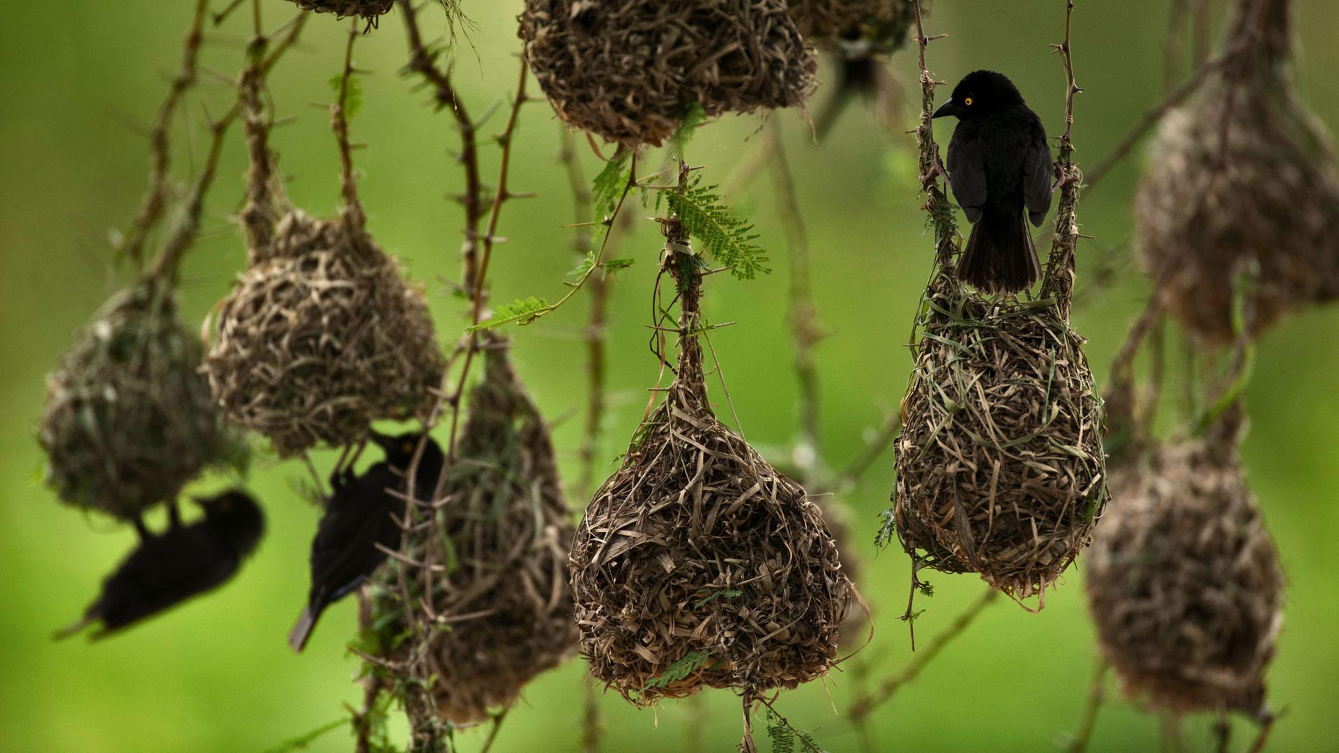 在乌干达伊丽莎白女王国家公园,你可能会看到壁纸中这样的织巢鸟巢穴。几乎所有的织巢鸟都以其精心制作的巢穴而闻名。通常情况下,雄鸟会认真仔细的编织一个非常美丽的巢穴来吸引一个伴侣,而且巢足够坚固,可以撑住孵化出来的幼鸟。织巢鸟的巢穴被认为是最精致的巢穴之一。