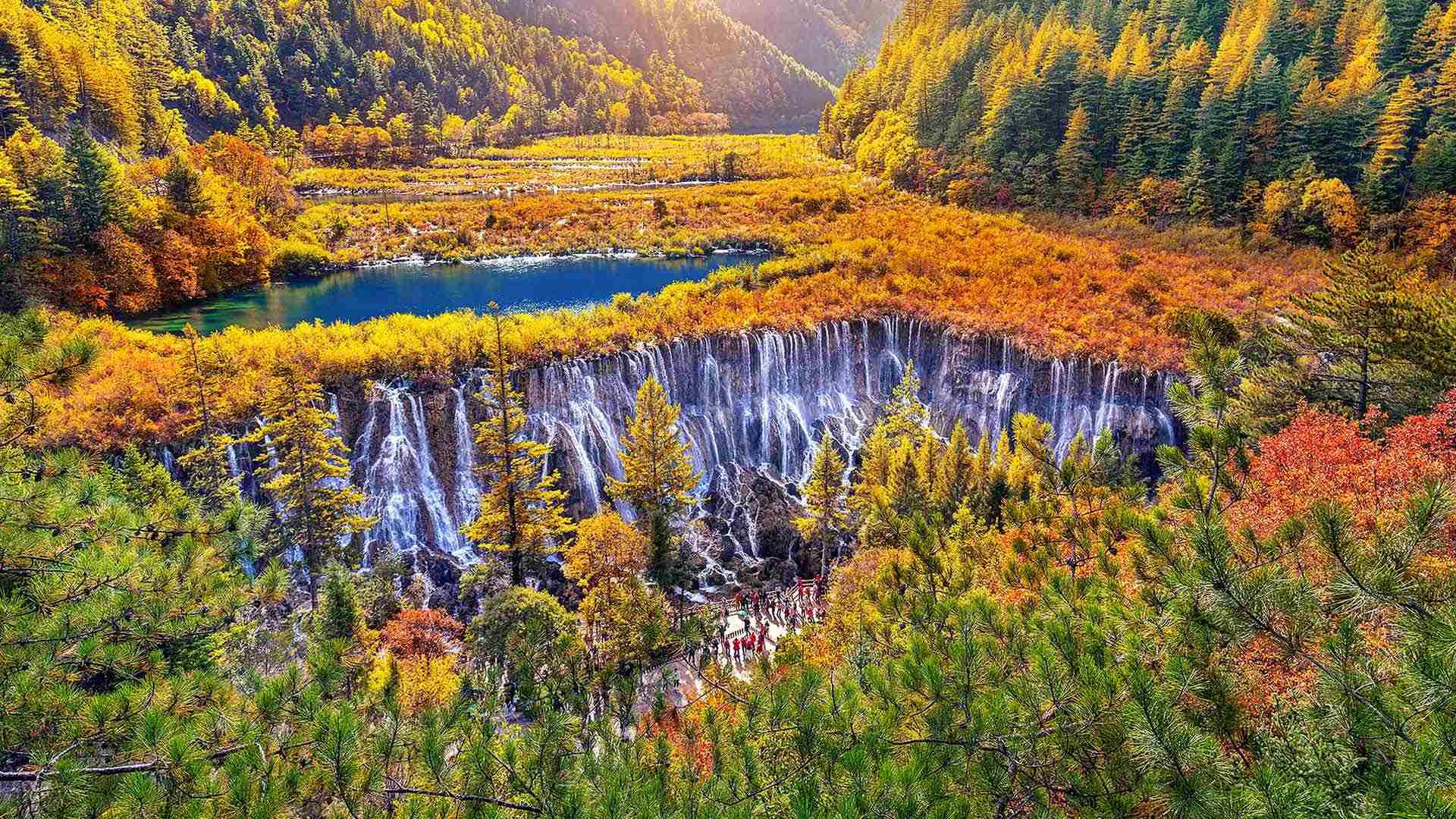 秋季九寨沟国家公园里的诺日朗瀑布, 四川省, 中国