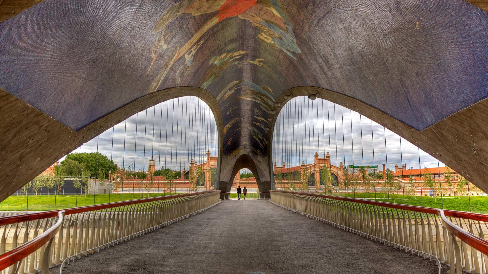 Matadero大桥与艺术家丹尼尔·卡诺卡的壁画,西班牙马德里 © Luis Davilla/age fotostock 当古老遇见未来 漫步古城马德里,这座外形极具未来特色的桥也许会吸引你的目光。停下来驻足细细观看, 你会发现桥顶上的壁画,这些精美的壁画都是出自艺术家丹尼尔·卡诺卡之手。这里曾是畜牧市场和屠宰场,而如今却成为马德里的艺术中心。 这座 西班牙 漫步 大桥 古城 艺术家 壁画 观看 特色 精美 卡诺 马德里 外形 细细 驻足