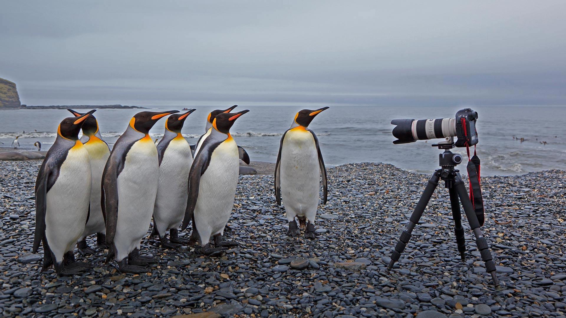 照片中这群可爱的小家伙就是国王企鹅,它们栖息在圣安德鲁斯海湾,每年许多国王企鹅都在这里大面积的繁殖,它们虽然有着短小的翅膀,但是却属于不会飞的海洋鸟类。摄影师和纪录片工作人员小心翼翼地在沙滩上,希望能够捕捉到更多温暖的画面来庆祝今天的世界摄影日。