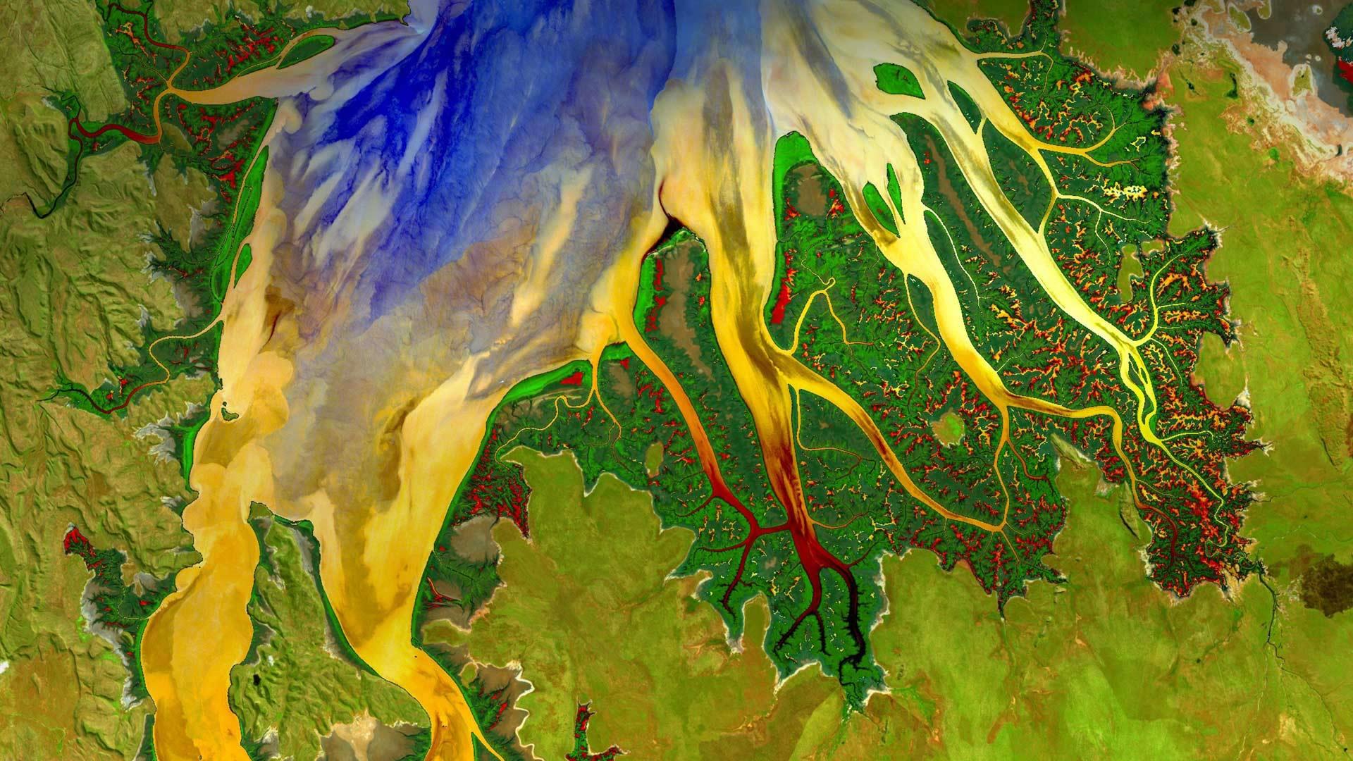 通过陆地卫星8号拍摄到的澳大利亚西部的剑桥湾河口 © World History Archive/Alamy 大海的温暖臂膀 至少有五条主要河流和许多较小的河流注入西澳大利亚北部海岸的剑桥湾河口。这张照片是由陆地卫星8号拍摄的,照片中的水、土地和河口流被分离出来,并增强了营养和植被的浓度,还经过了重新整合。这样看起来的视觉效果呈现五彩缤纷的质感。 海岸 澳大利亚 照片 这张 拍摄 河流 看起来 卫星 陆地 五彩缤纷 西澳大利亚 视觉 河口 西部 植被